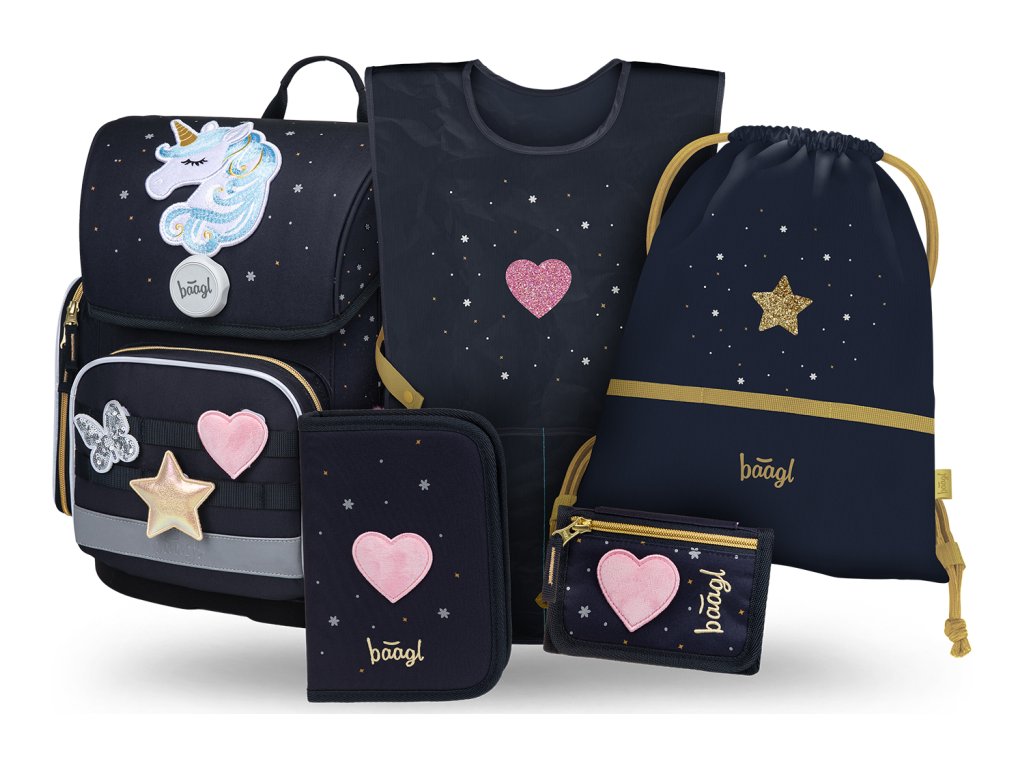 BAAGL SET 5 Ergo Unicorn Gold: aktovka, peračník, vrecko, zástera, peňaženka