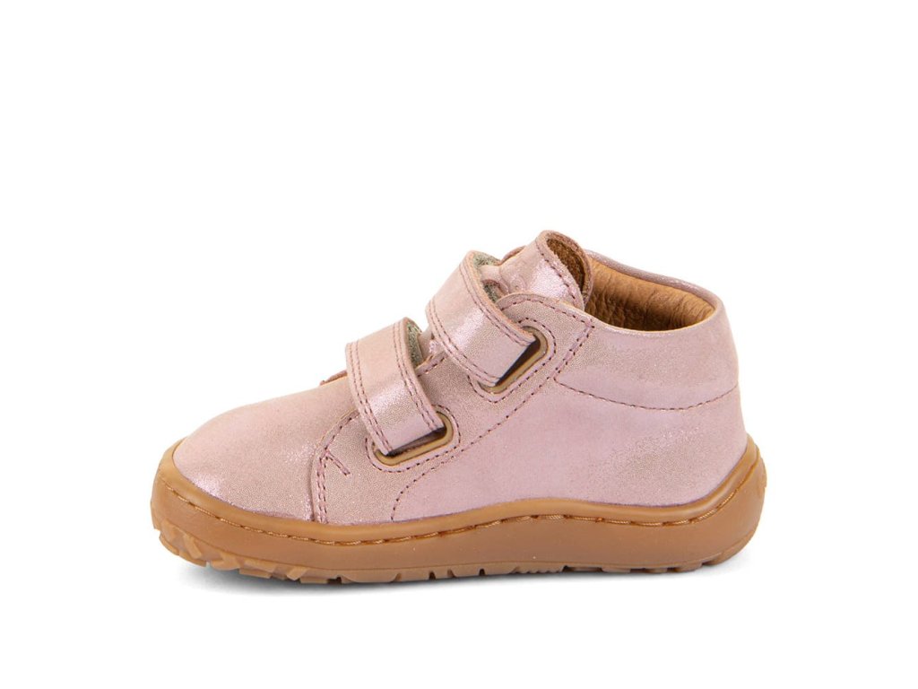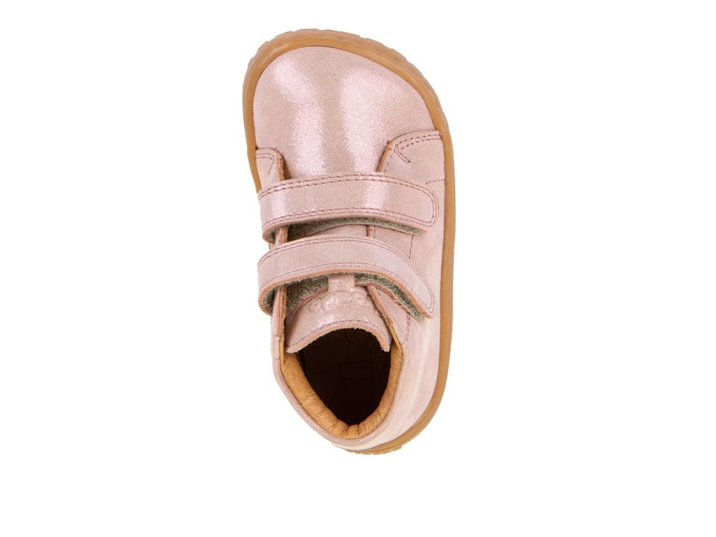 Detské barefoot celoročné topánky Barefoot Froddo G2130369-11 Pink Shine v trblietavej ružovej farbe sú členkové kožené topánky . Vhodné na jar, jeseň, ale aj na chladné leto. Kombinujú štýlový dizajn a ľahké obúvanie aj pre deti. Vrchná časť topánky je kompletne kožená, a rovnako tak aj podšívka je z jemnej kože. Praktické zapínanie na suchý zips umožňuje ľahké obúvanie aj deťom. Podrážka je z gumy.
