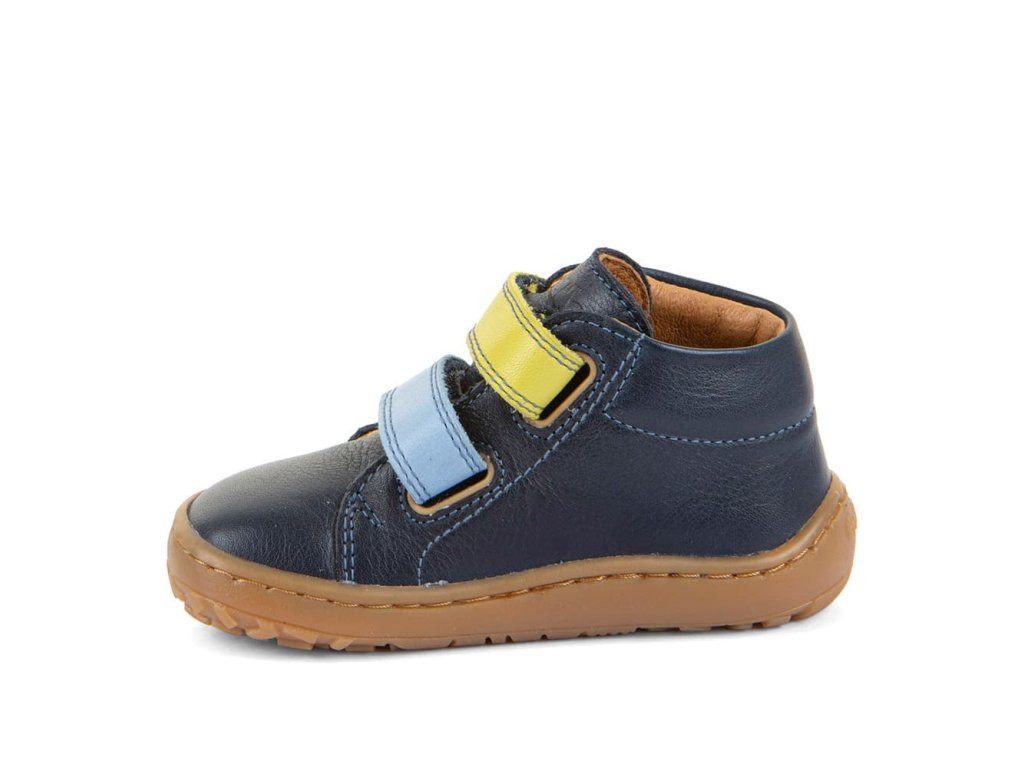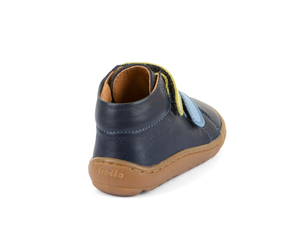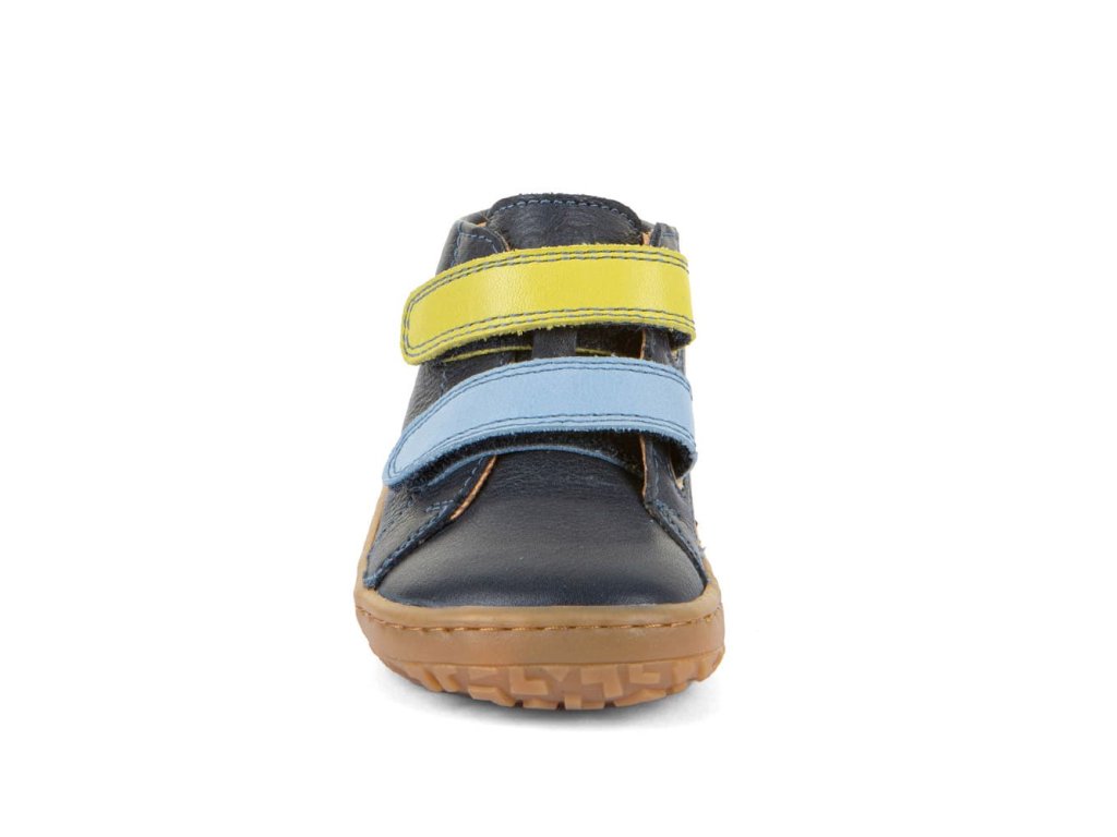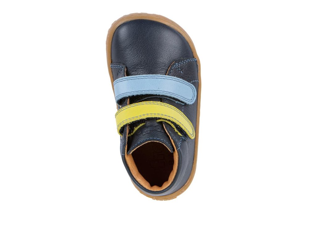 Detské barefoot celoročné topánky Barefoot Froddo G2130369-3 Blue/ Denim v tmavo modrej farbe a farebnými velrco pásikmi sú členkové kožené topánky . Vhodné na jar, jeseň, ale aj na chladné leto. Kombinujú štýlový dizajn a ľahké obúvanie aj pre deti. Vrchná časť topánky je kompletne kožená, a rovnako tak aj podšívka je z jemnej kože. Praktické zapínanie na suchý zips umožňuje ľahké obúvanie aj deťom. Podrážka je z gumy.