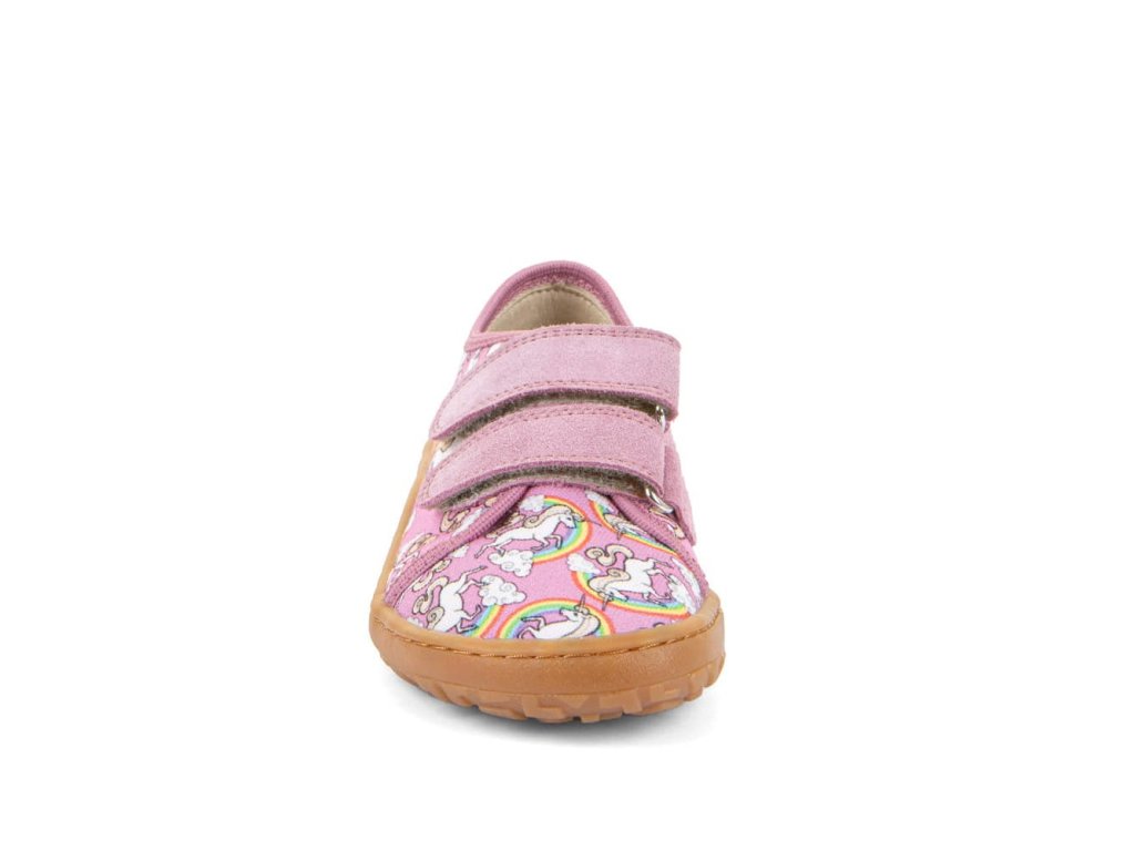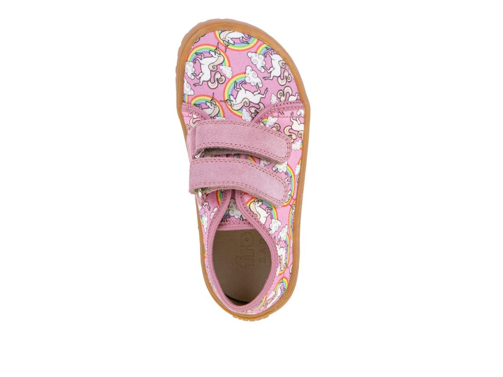 Barefoot textilné tenisky Barefoot Froddo White/Pink G1700440-12 s obľúbeným motívom jednorožcov a dúhy. Textilná vrchná časť s dvoma suchými zipsami z kože a podrážka z gumy. Upravený model s novou ekologickejšou vnútornou stielkou z mikrovlákna. Dajú sa použiť ako tenisky pre teplejšie dni, papuče alebo topánky do telocviku.