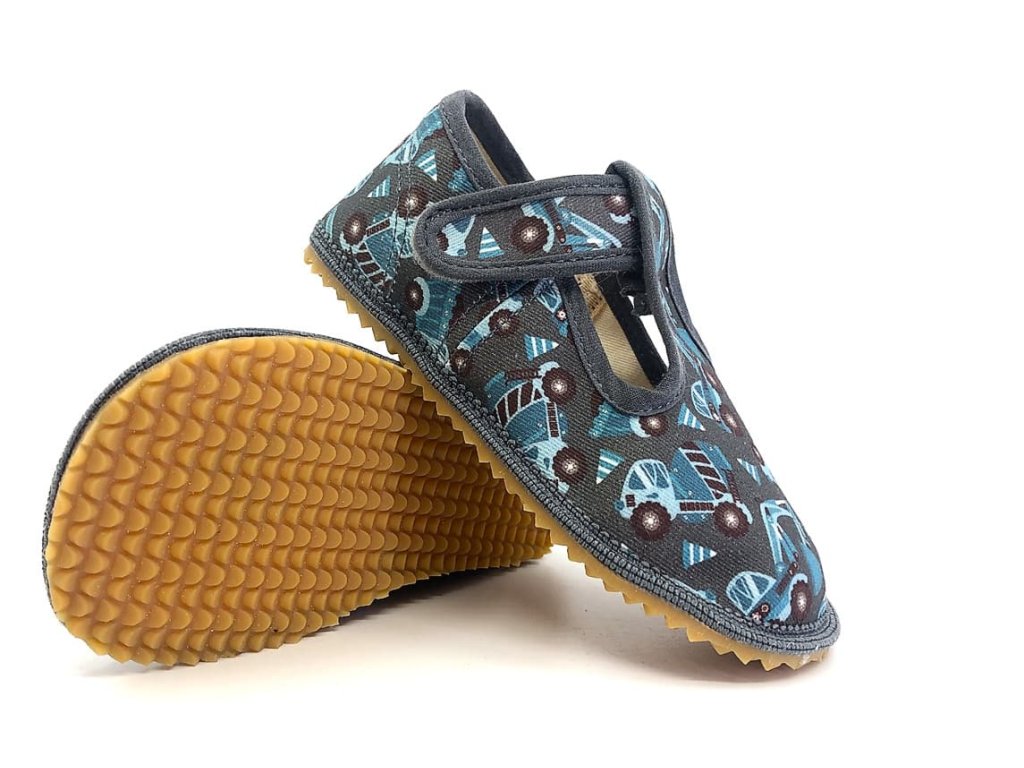Detské barefoot papuče Beda Trucks BFN 060010/W, v tmavo šedej farbe s modrými nákladiakmi a bagermi. Vyrobené v SR.