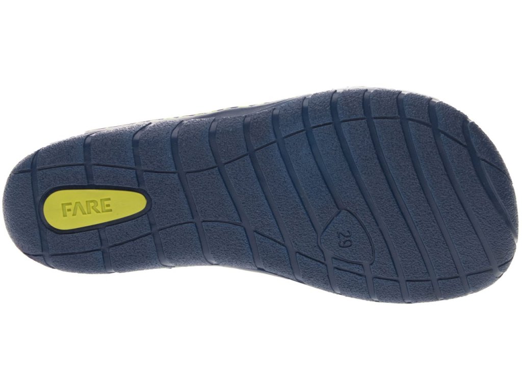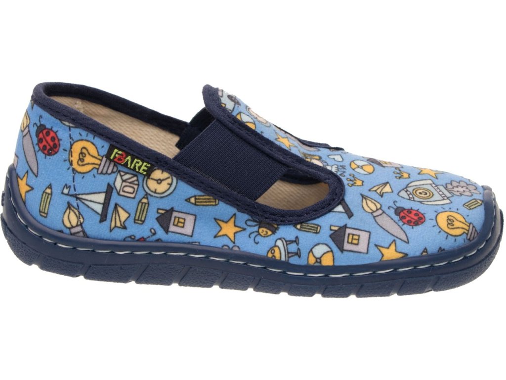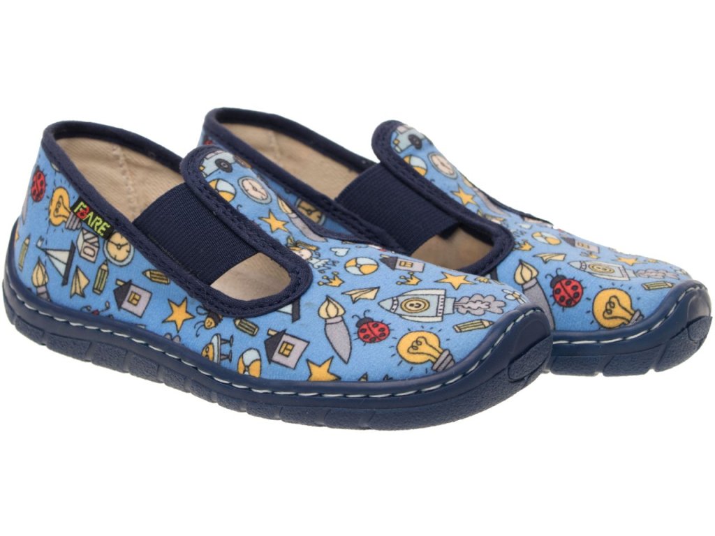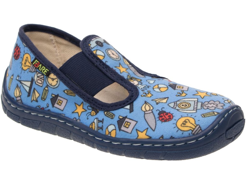 Papuče FARE BARE sa odlišujú od bežných papučov predovšetkým výrazne väčším priestorom v prstovej časti. Majú ambíciu neobmedzovať vývoj nohy najmä v prednej časti chodila, kde poskytujú oveľa väčší priestor. Vynikajú aj svojou ľahkosťou a vysokou flexibilitou. Papučky sú v modrom chlapčenskom prevedení sú vhodné na doma, do škôlky aj do školy. Zapínanie na gumičku zaistí upevnenie na nohe a zároveň zjednoduší obúvanie.