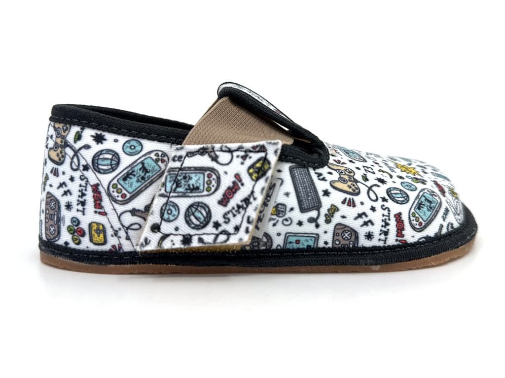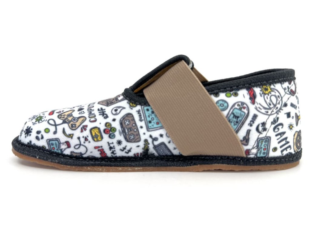 Novinka od Pegres - obľúbené papuče Pegres BF01 Gaming v novej čierno-bielej kombinácii s hernými motívmi. Tvarom sú úplne rovnaké ako ostatné modely BF01 a BF03 - barefoot papučky šité na nových kopytoch. Tvar špičky je 100% barefoot s dostatkom miesta pre prsty - oproti radu "Bosé Pegresky" sú vhodné aj na dominantné palce. Prsty majú dostatok miesta nielen do šírky, ale vďaka novému tvaru aj do výšky - papučky sa smerom do špičky neznižujú. Výborná ohybnosť, pekný jednoduchý dizajn, krásne spracovanie, zvršok je z priedušnej textílie.