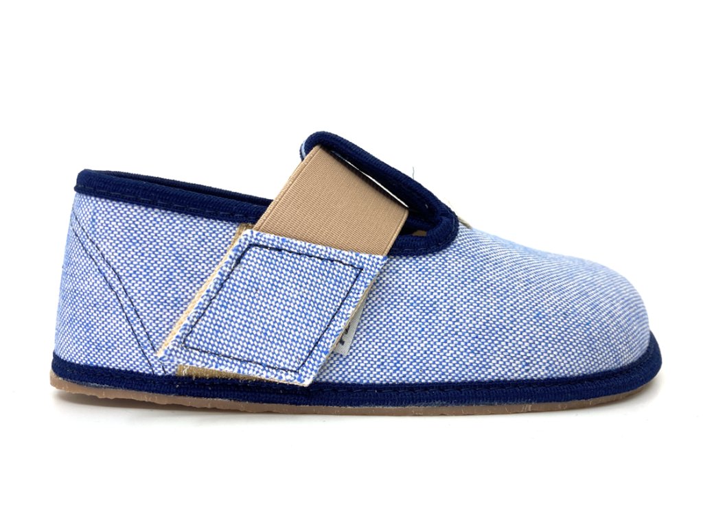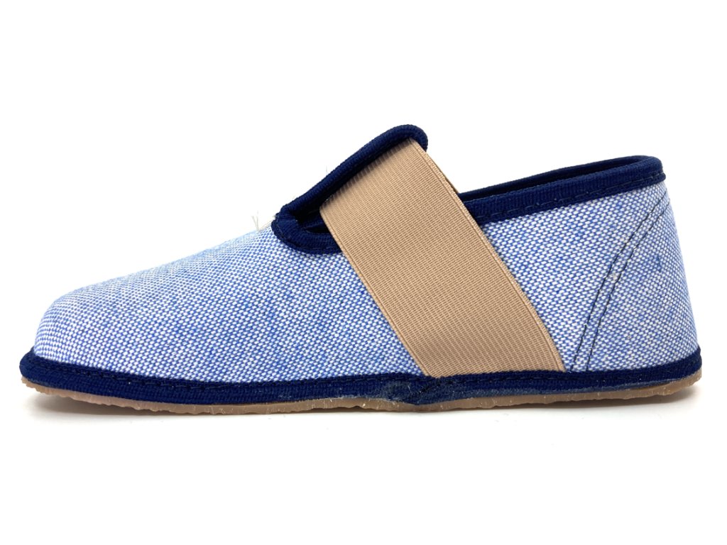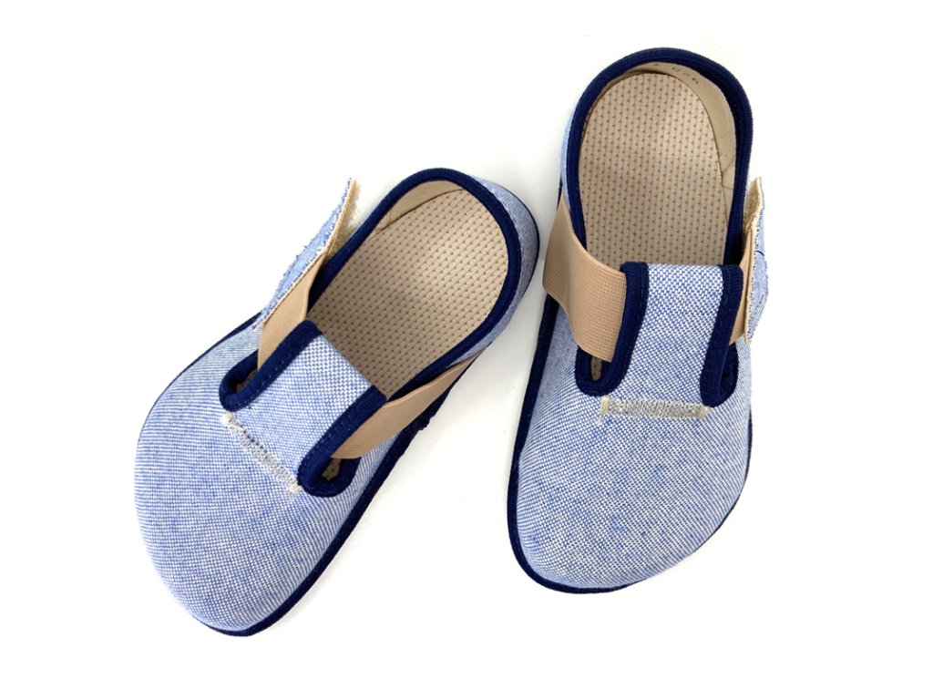 Papuče Pegres BF01 v novej modrej farbe - barefoot papučky šité na nových kopytoch. Nový tvar špičky je 100% barefoot s dostatkom miesta pre prsty - oproti radu "Bosé Pegresky" sú vhodné aj na dominantné palce. Prsty majú dostatok miesta nielen do šírky, ale vďaka novému tvaru aj do výšky - papučky sa smerom do špičky neznižujú. Výborná ohybnosť, pekný jednoduchý dizajn, krásne spracovanie, zvršok je z priedušnej textílie.
