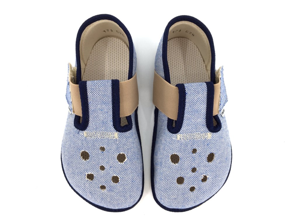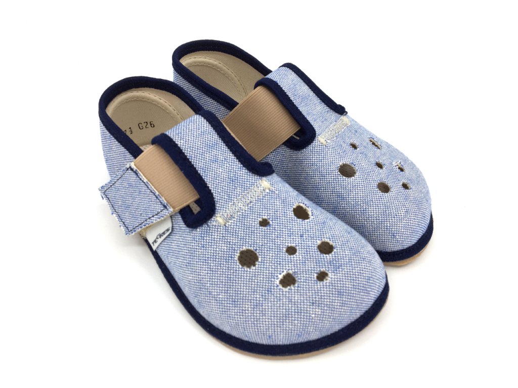 Pegres BF03 - podarená novinka z mája 2020 - barefoot papučky šité na nových kopytoch. Nový tvar špičky je 100% barefoot s dostatkom miesta pre prsty - oproti radu "Bosé Pegresky" sú vhodné aj na dominantné palce. Prsty majú dostatok miesta nielen do šírky, ale vďaka novému tvaru aj do výšky - papučky sa smerom do špičky neznižujú. Výborná ohybnosť, pekný jednoduchý dizajn, krásne spracovanie, zvršok je z priedušnej textílie.