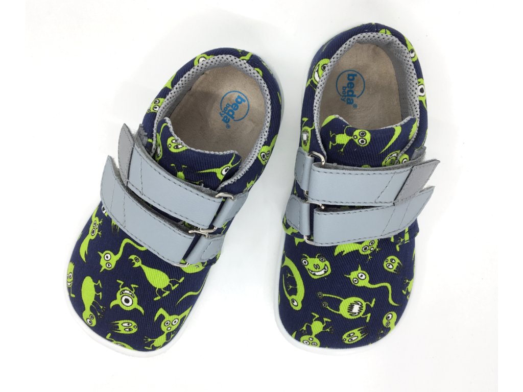 Tmavomodré barefoot tenisky Beda Monsters so zelenými príšerkami . Nôžky v nich budú ako v papučkách - pohodlný širší strih rešpektujúci tvar nohy - veľmi priestranná špička, mäkké, ľahké, ohybné. Reflexný prvok na velcro pásku pre dobrú viditeľnosť a bezpečnosť vášho dieťaťa.