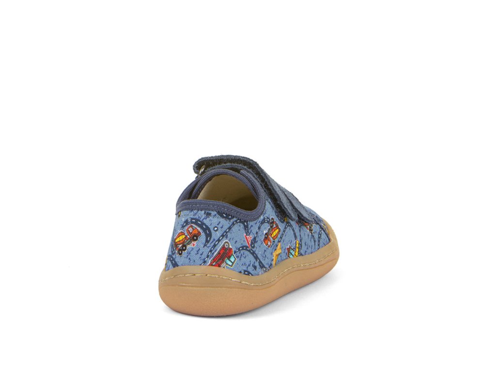 Textilné tenisky Froddo Barefoot G1700379-30 Denim+ v džínsovo modrej farbe s autami zo stavby. Textilná vrchná časť s dvoma suchými zipsami z modrej kože a podrážka z prírodnej gumy. Upravený model s novou ekologickejšou vnútornou stielkou z mikrovlákna.