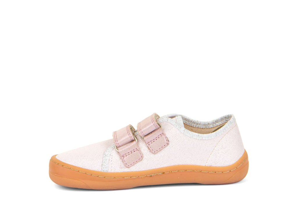 Textilné tenisky Froddo Barefoot G1700379 Pink Shine - staroružové s trblietkami. Textilná vrchná časť s dvoma suchými zipsami z ružovej kože s trblietkami a podrážka z prírodnej gumy. Upravený model s novou ekologickejšou vnútornou stielkou z mikrovlákna.