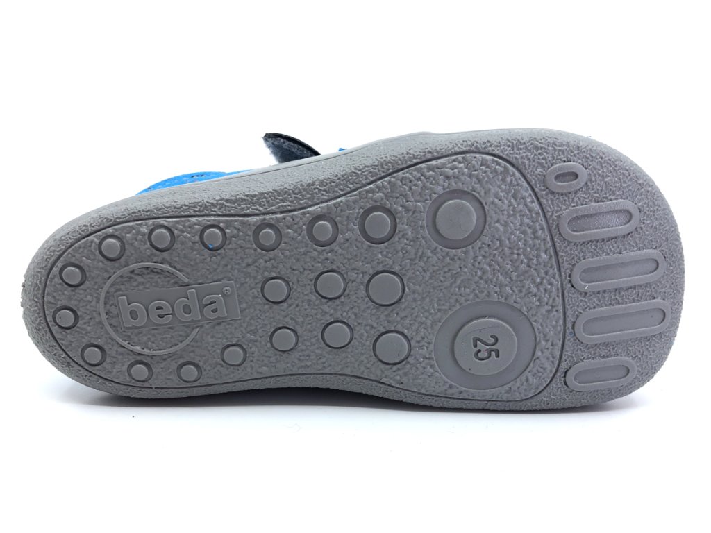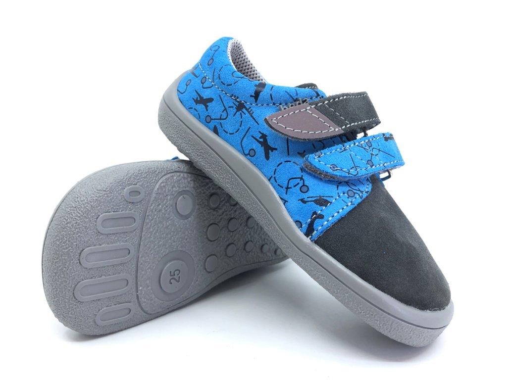 Celoročné kožené 100% barefoot topánky Beda Aeroplane BF 0001/W/N/TS v šedej farbe v kominácii s modrou s lietadlami. Nôžky v nich budú ako v bavlnke - pohodlný širší strih rešpektujúci tvar nohy - veľmi priestranná špička, mäkučké, ľahučké, ohybné. Reflexný prvok na velcro pásku pre dobrú viditeľnosť a bezpečnosť vášho dieťaťa.