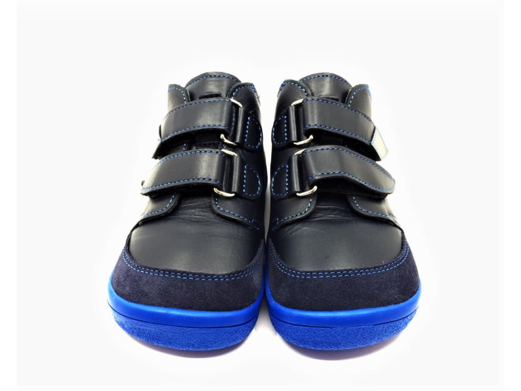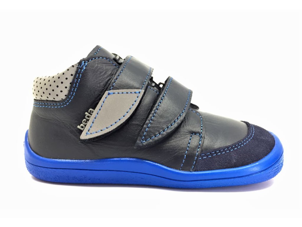Členkové celoročné kožené topánky Beda Dan BF 0001W/M/SO/2/OP v užšom prevedení v oblasti päty a členku. Topánky sú teda vhodné aj pre deti s užším členkom/pätou. Kompletne modrá farba vrátane okopu aj podrážky doplnená o reflexné prvky na veľro opasku av oblasti achilovky. Plnohodnotná barefoot obuv rešpektujúca tvar nohy, veľmi priestranná špička vhodná skôr pre typ nôh, kde sú pre prstíky v jednej rovine a taktiež pre dominantný palec. Topánky sú maximálne pohodlné, mäkučké a vďaka membráne TE-POR sú odolné voči vode a zároveň priedušné.