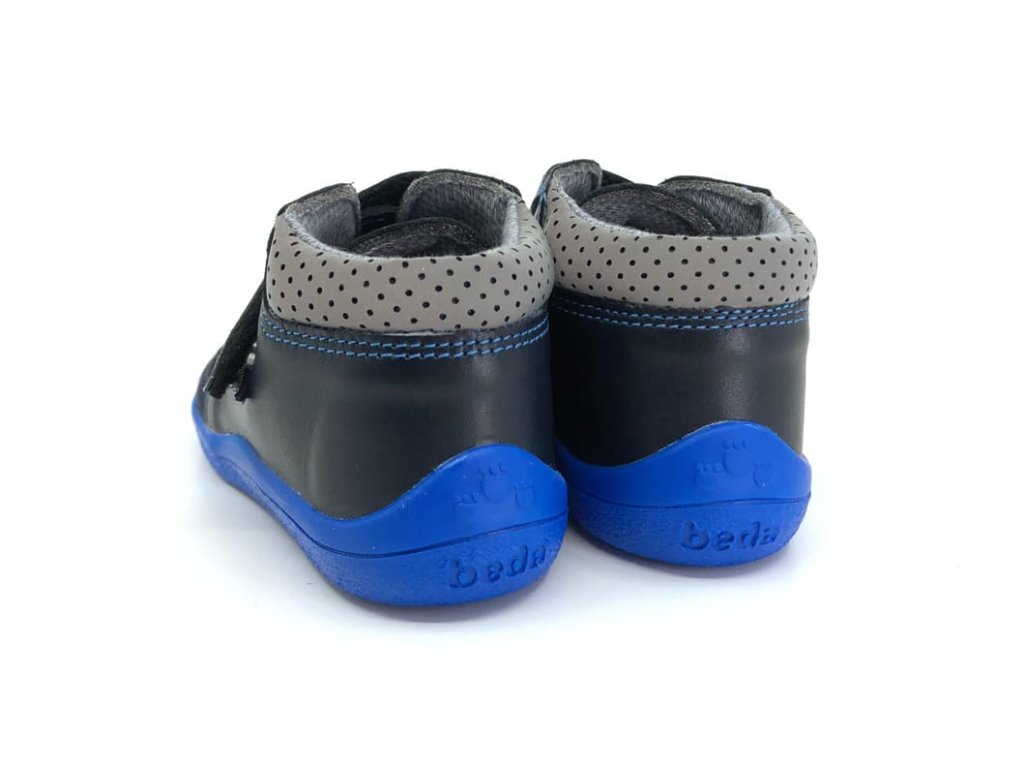 Členkové celoročné kožené topánky Beda Dan BF 0001W/M/SO v širšom prevedení. Topánky nie sú vhodné pre deti s úzkym členkom/pätou. Kompletne modrá farba vrátane okopu aj podrážky doplnená o reflexné prvky na veľro opasku av oblasti achilovky. Plnohodnotná barefoot obuv rešpektujúca tvar nohy, veľmi priestranná špička vhodná skôr pre typ nôh, kde sú pre prstíky v jednej rovine a taktiež pre dominantný palec. Topánky sú maximálne pohodlné, mäkučké a vďaka membráne TE-POR sú odolné voči vode a zároveň priedušné.