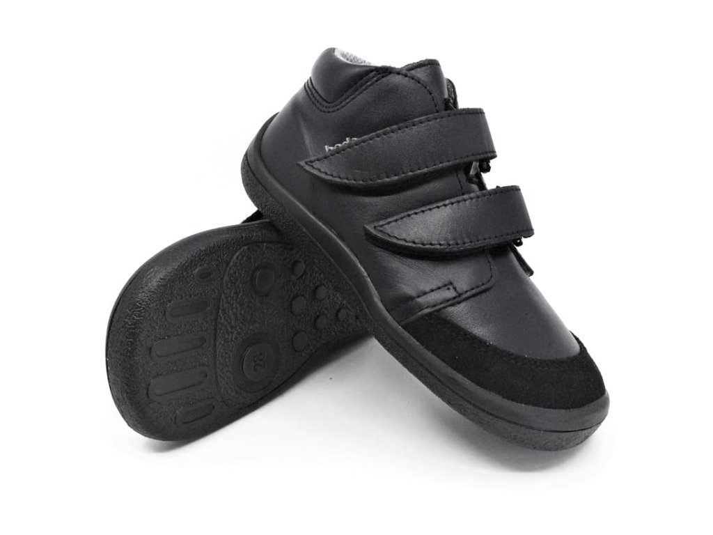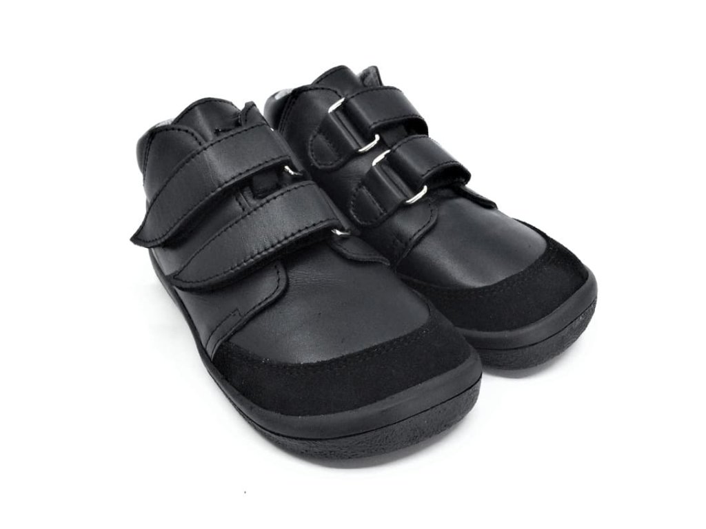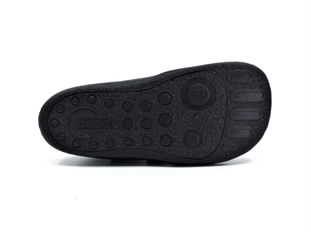 Členkové celoročné kožené topánky Beda Just Black BF0001W/M/SO/2/OP v užšom prevedení v oblasti členku. Kompletne čierna farba vrátane okopu aj podrážky. Plnohodnotná barefoot obuv rešpektujúca tvar nohy, veľmi priestranná špička vhodná skôr pre typ nôh, kde sú pre prstíky v jednej rovine a taktiež pre dominantný palec. Topánky sú maximálne pohodlné, mäkučké a vďaka membráne TE-POR sú odolné voči vode a zároveň priedušné.