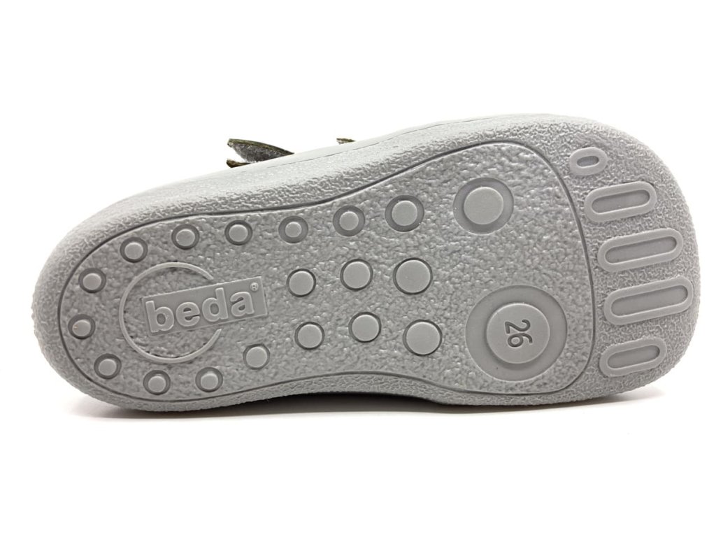 Členkové celoročné kožené topánky Beda Nick BF 0001/W/M/NUB v khaki farbe v kombinácii so šedou podrážkou a okopom, s reflexnými prvkami na golieri okolo členku a na velcro pásku. Plnohodnotná barefoot obuv rešpektujúca tvar nohy, veľmi priestranná špička vhodná skôr pre typ nôh, kde sú pre prstíky v jednej rovine a taktiež pre dominantný palec. Topánky sú maximálne pohodlné, mäkučké a vďaka membráne TE-POR sú odolné voči vode a zároveň priedušné.