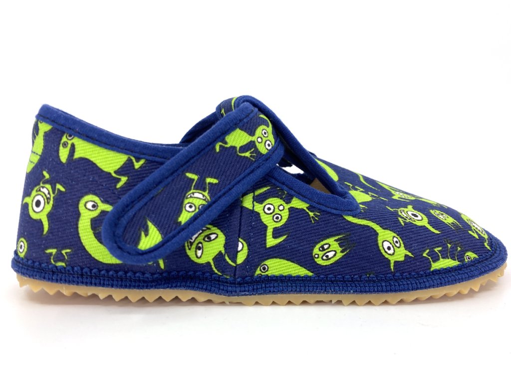 Detské barefoot papuče českého výrobcu Beda, v tmavo modrej farbe s veselými zelenými príšerkami.