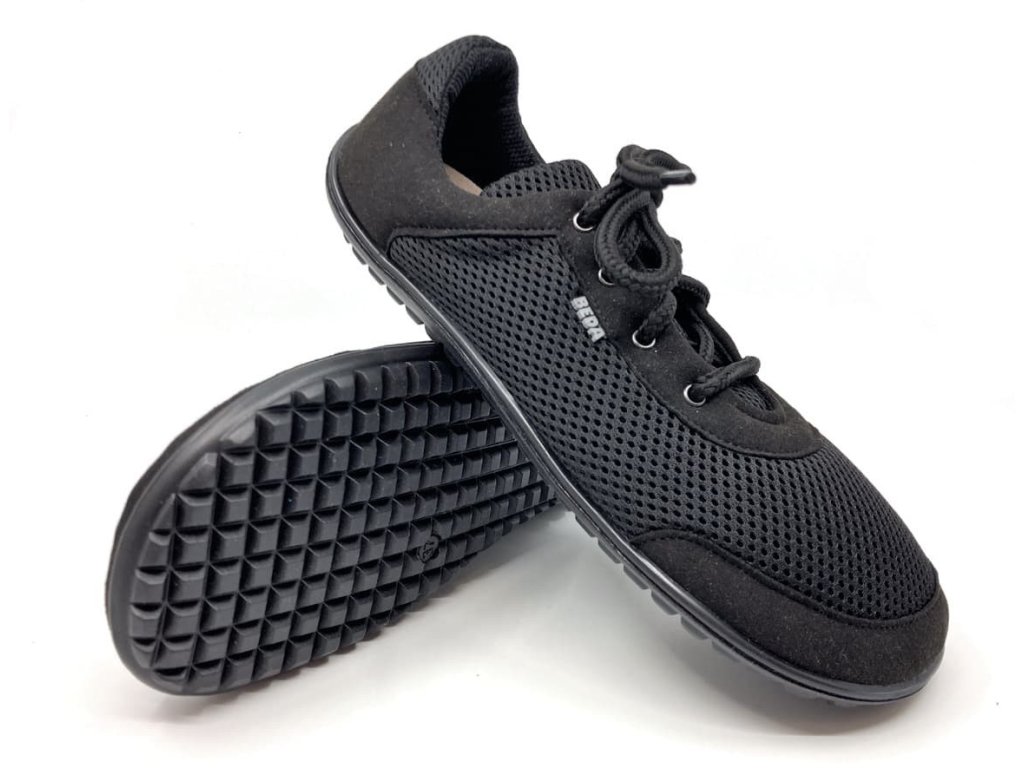 Mäkké, priedušné barefoot tenisky Beda BF 0002/SK Black disponujú priestrannou špičkou, výborne ohybnou podrážkou všetkými smermi bez dropu (podrážka je v jednej rovine bez navýšenia pod pätou) a mäkkým opätkom. Topánky sú veľmi poddajné a pohodlné.