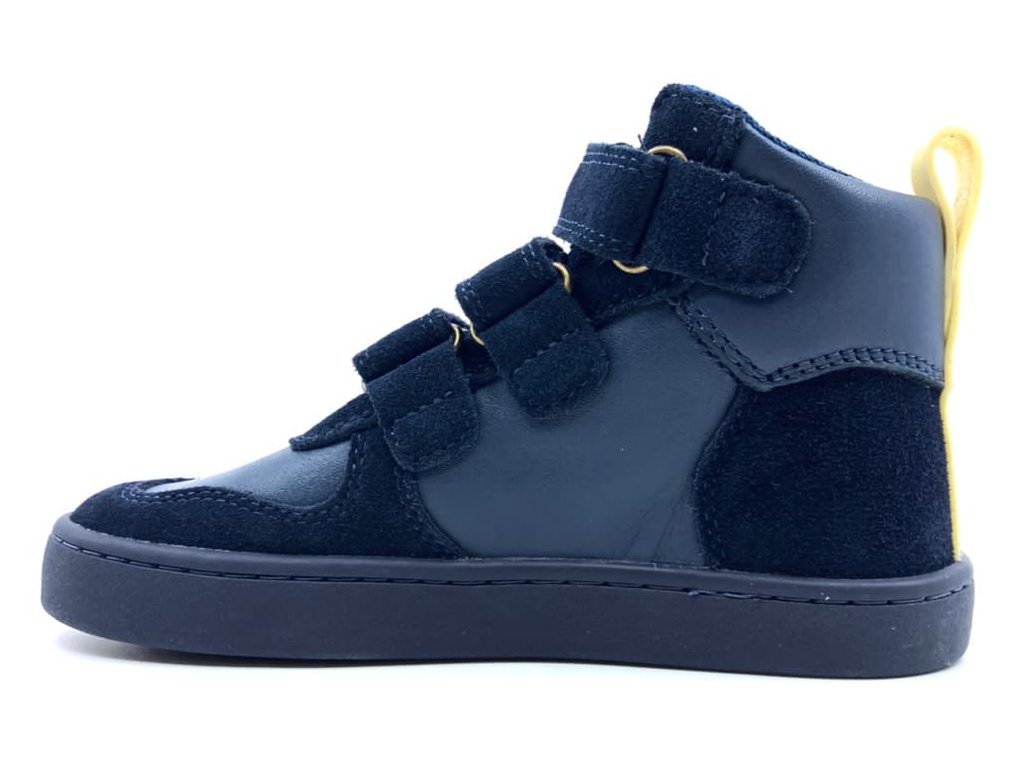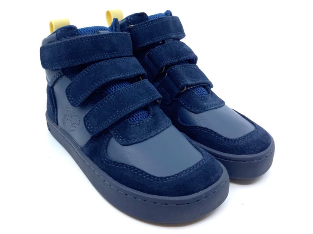 Detské celoročné barefoot topánky Bundgaard Nero Navy v uni tmavo modrej farbe so žltým pútkom sú parádne na každodenné nosenie. Zvršok tvorí kombinácia hladkej a brúsenej kože, podšívku priedušná textília. Vonkajšie bočné strany zdobia dierovaný zajačik.