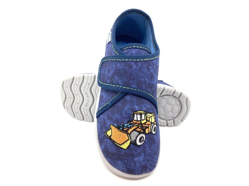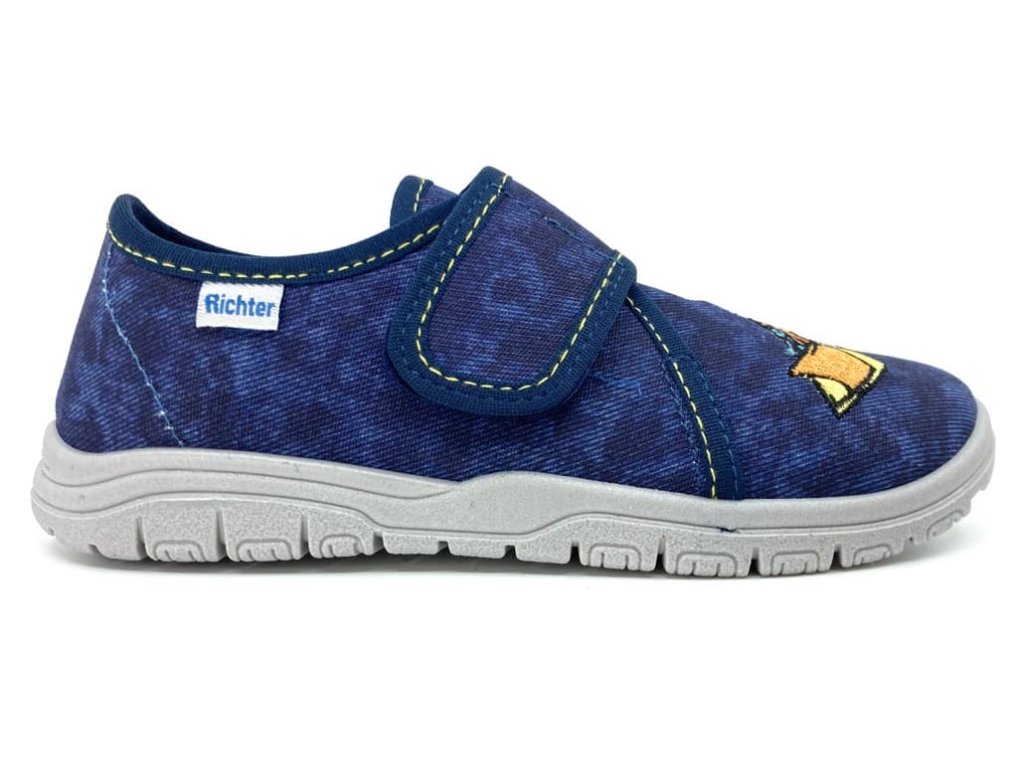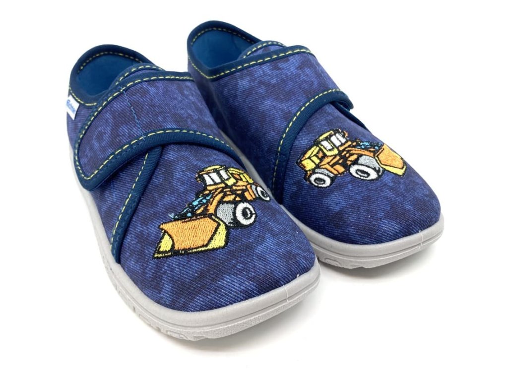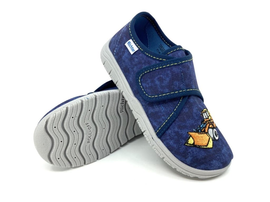 Chlapčenské papuče Richter 9000-3292 Baumwolle Stick Digger v modrej farbe s motívom bagru sú pohodlné papuče so zapínaním na suchý zips, ideálne aj pre vyšší priehlavok. Podrážka je mäkká, ohybná, s vetracími otvormi pre lepšiu priedušnosť, a vyvýšenými časťami proti okopu. Tieto papuče sú skvelou voľbou na doma do škôlky aj do školy.
