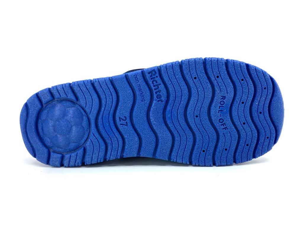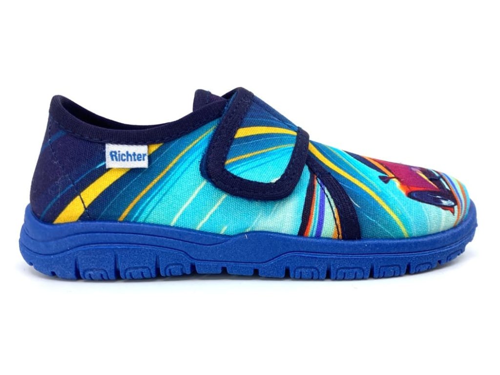 Chlapčenské papuče Richter 9000-3296 Baumwolle Dig. Roads2 v modrej farbe s motívom auta sú pohodlné papuče so zapínaním na suchý zips, ideálny aj pre vyšší priehlavok. Podrážka je mäkká, ohybná, s vetracími otvormi pre lepšiu priedušnosť, a vyvýšenými časťami proti okopu. Tieto papuče sú skvelou voľbou na doma do škôlky aj do školy.