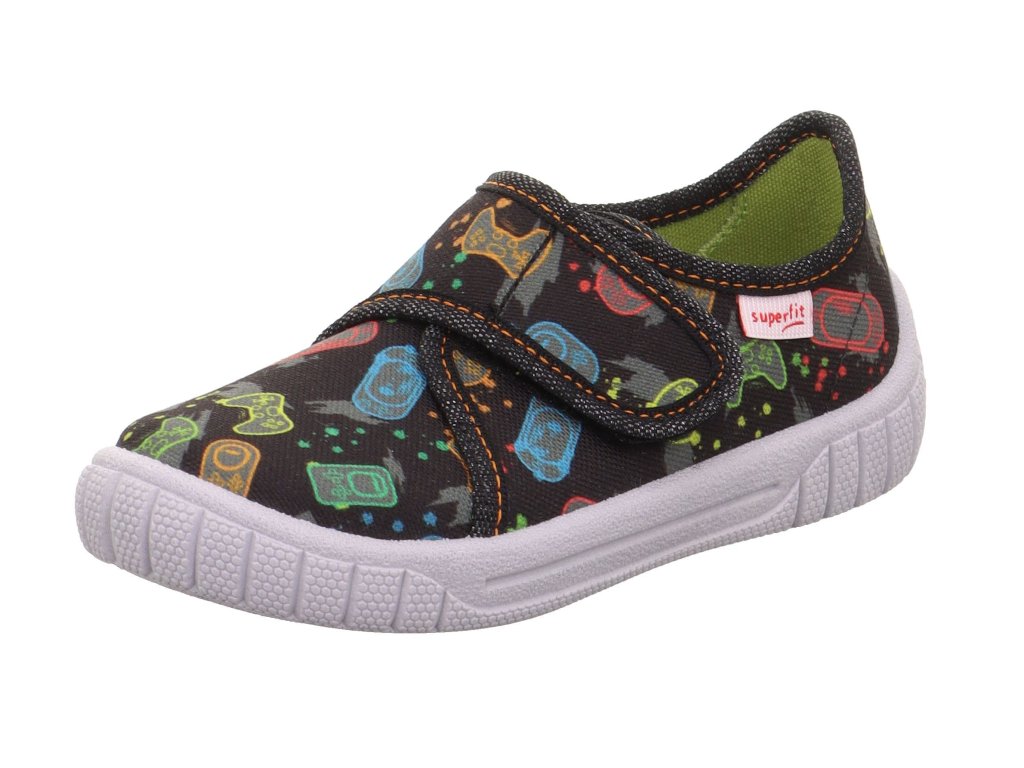 Detské papuče Superfit Bill 1-000279-0000 v čiernej farbe s game motívom sú pohodlné papuče so zapínaním na suchý zips, ideálny aj pre vyšší priehlavok. Vďaka vykrojeniu okolo členku perfektne sadnú a dobre sa nosia. Podrážka je mäkká, ohybná, s vetracími otvormi pre lepšiu priedušnosť, a vyvýšenými časťami proti okopu. Tieto papuče sú skvelou voľbou na doma do škôlky aj do školy.