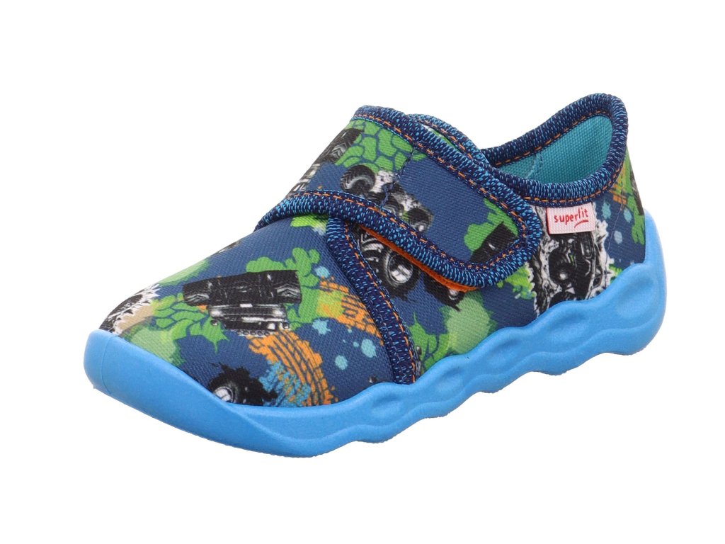 Detské papuče Superfit Bubble 1-006273-8050 v tmavo zelenej farbe s motívom Monster truckov sú skvelé do škôlky, školy aj na doma . Vďaka suchému zipsu sa dajú krásne regulovať v oblasti priehlavku a ľahko ich tak obujú aj deti s vyšším priehlavkom . V okolí členku je mierne vykrojenie, topánka de facto kopíruje nôžku a je naozaj pohodlná.