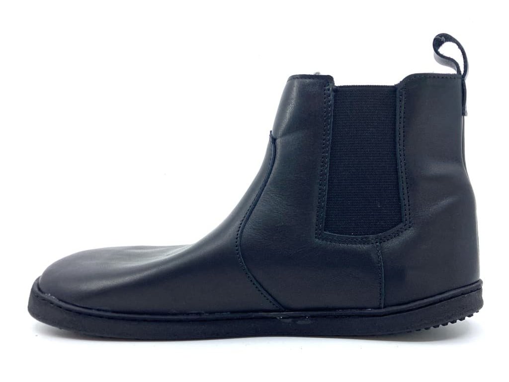 Dámske barefoot zimné topánky typu Chelsea Pegres BF58 v čiernej farbe z hladkej kože. Sú zateplené hrejivým (umelým) kožúškom . Minimalistický štýl vhodný k legínam, sukni, pančuchám aj rifliam. Hladká koža je dobre umývateľná, prospeje jej občasné premazanie balzamom na koži.