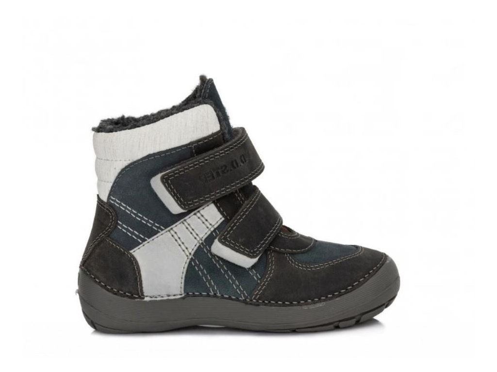Chlapčenské zimné barefoot topánky, teda topánky s tenkou a ohybnou podrařkou a dostatkom miesta pre prsty, značky DD Step s dvoma suchými zipsami, v khaki farbách, so šedou podrážkou. Teplý kožúšok vo vnútri. Zvýšená gumová špička chránená proti okopaniu. Pomerne tenká a ohybná podrážka. Reflexný prvok na vonkajšej strane a na suchých zipsoch.