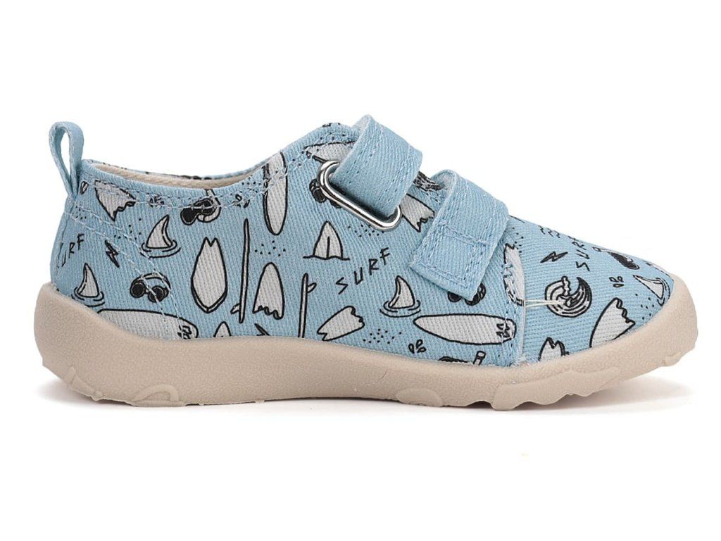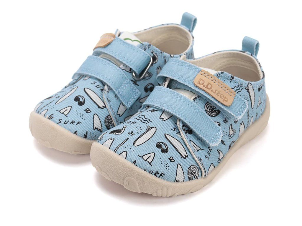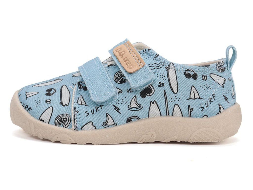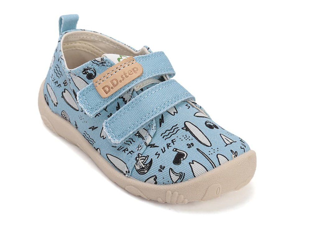 Detské barefoot papuče/ plátenky. DD Step C086-61877 Turquise v tyrkysovej farbe so surf motívom . Topánky sú perfektne priedušné , mäkké a ohybné . Vyberateľná penová stielka je potiahnutá mikrovláknom. Opätok je mäkký a nikde netlačí. Podrážka je perforovaná pre lepšiu ventiláciu.