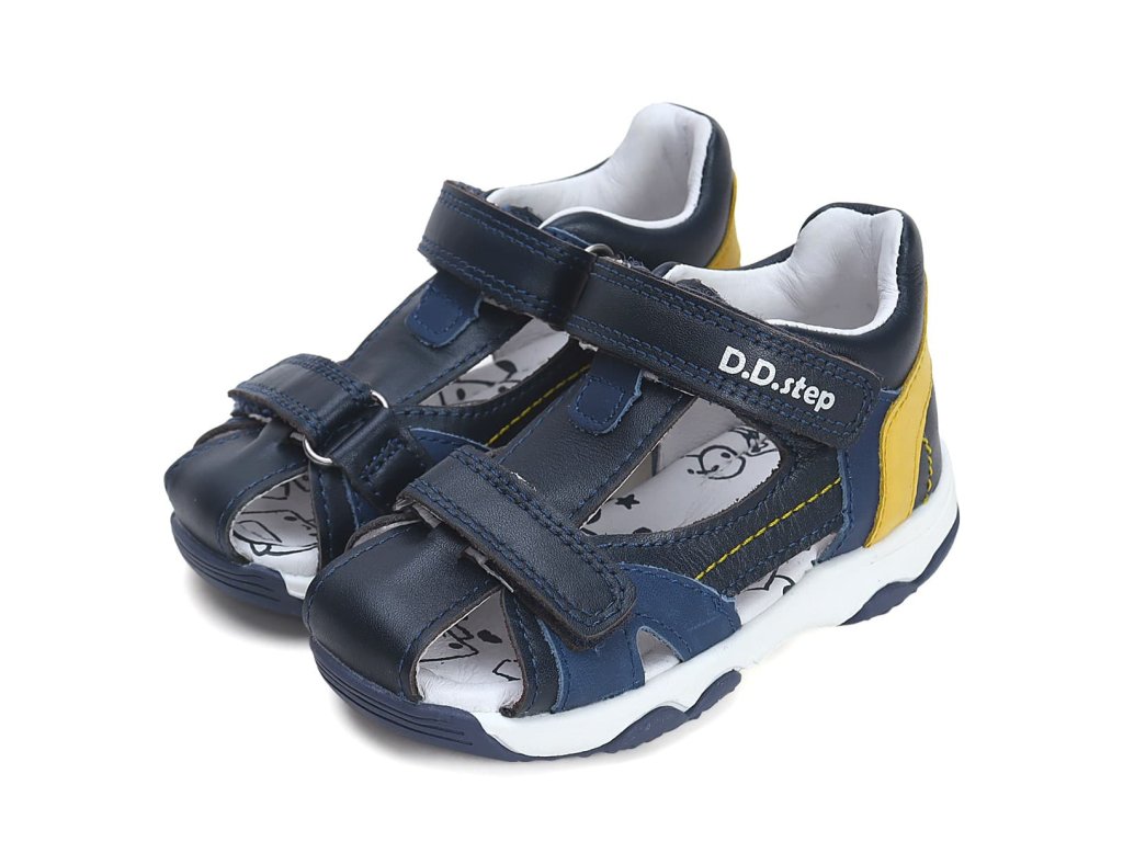 Pohodlné, elegantné chlapčenské kožené sandále DD Step G064-41451 Royal Blue v tmavo modrej farbe s okrovými detailmi.