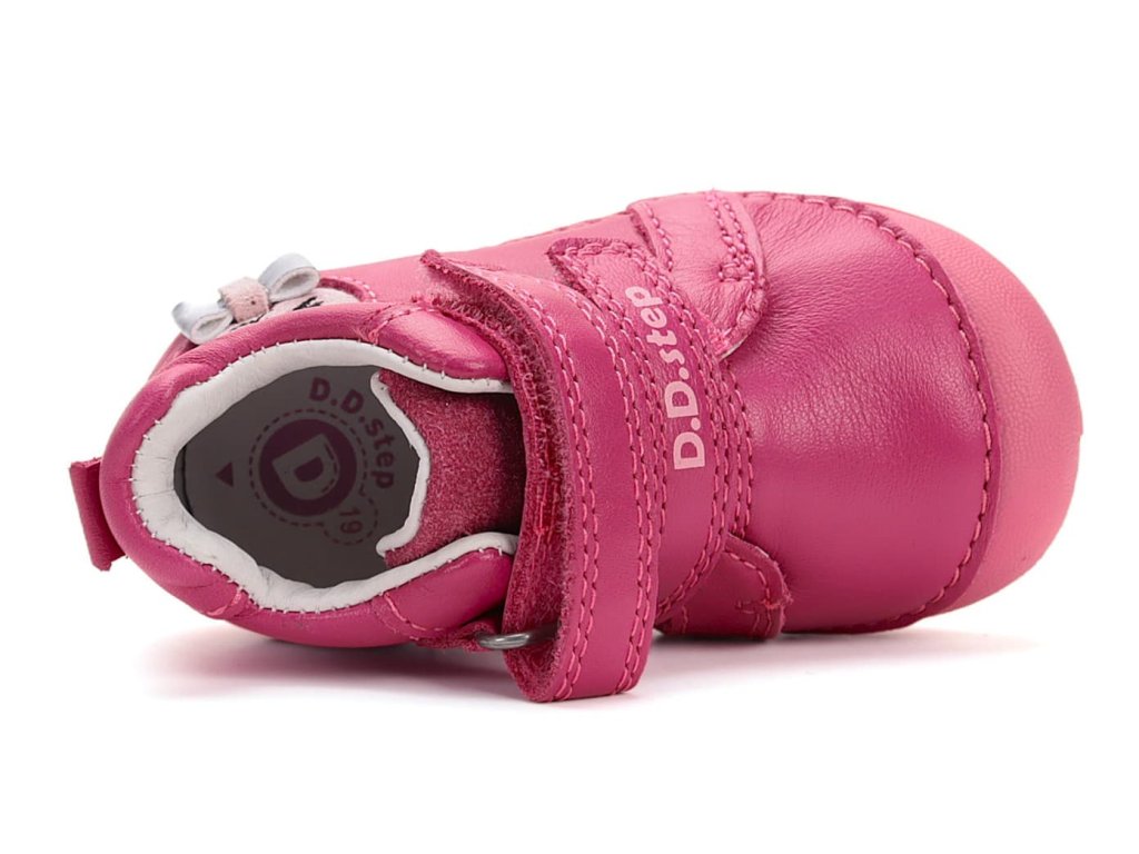 Dievčenské celoročné topánky DD Step S015-52412A sadnú na normálne aj širšie nôžky, padnú tiež na vyšší priehlavok. Zapínanie na dva suché zipsy na optimálne upevnenie na nohe. Tenká gumová podrážka, kožené vnútro, stielka, aj vrchná časť. Kompromis medzi barefoot a klasickou obuvou s guľatou špičkou - nevhodné pre dominantný palec.