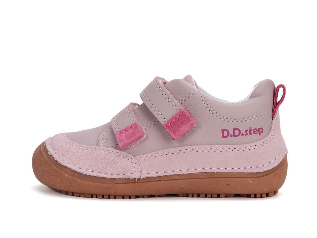 Inovované barefoot celoročky S063 - najohybnejšia topánka od DDstep - novo s nulovým dropom. DD Step novo označuje kožené topánky písmenom S na začiatku názvu, preto S063. Konkrétne DDstep S063-51483c Pink je z hladkej kože v ružovej farbe s praktickým okopom z brúsenej kože. Topánky sú z hladkej, dobre umývateľnej kože (len jazyk a okop sú z brúsenej kože).