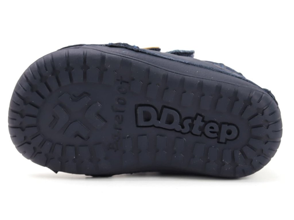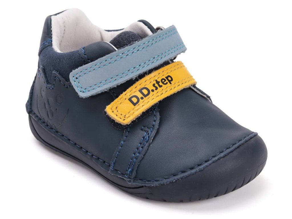DD step s070-52141B Royal Blue - chlapčenské barefoot topánky vhodné na normálne a širšie nôžky. Z praktickej hladkej kože v modrej farbe s motívom psíka na boku a farebnými suchými zipsami. Široká predná časť a výborne tvarovaná špička aj pre dominantný palec (teda prípad, keď je palec dlhší ako ostatné prsty).