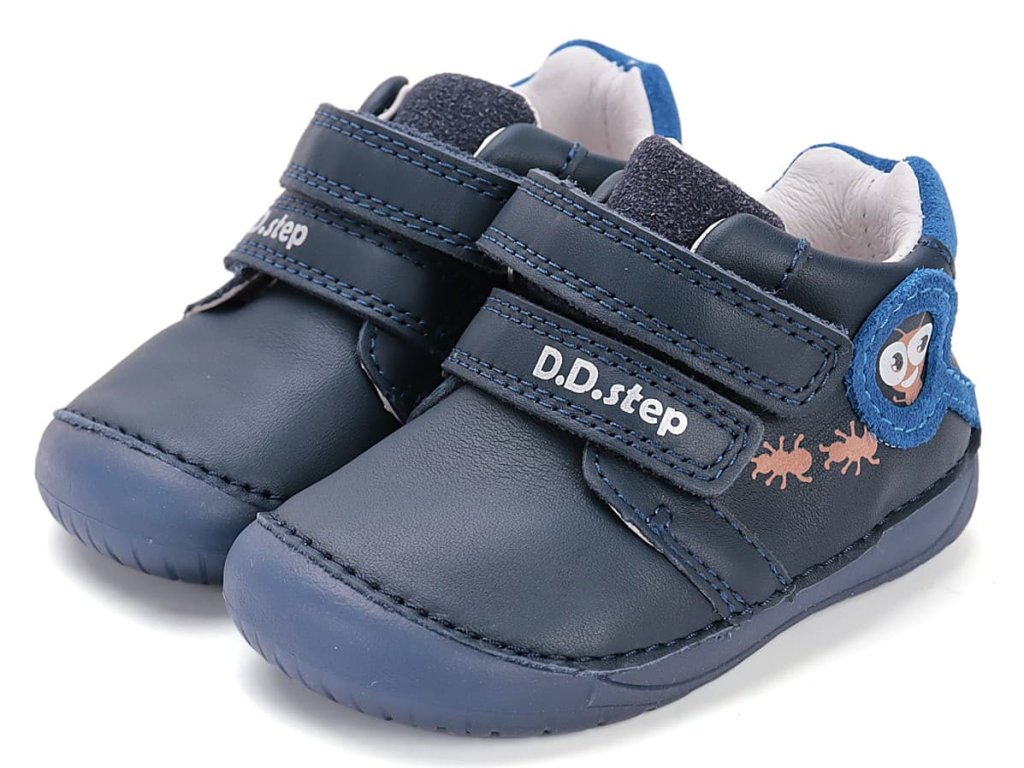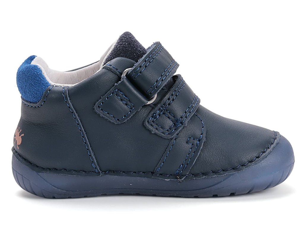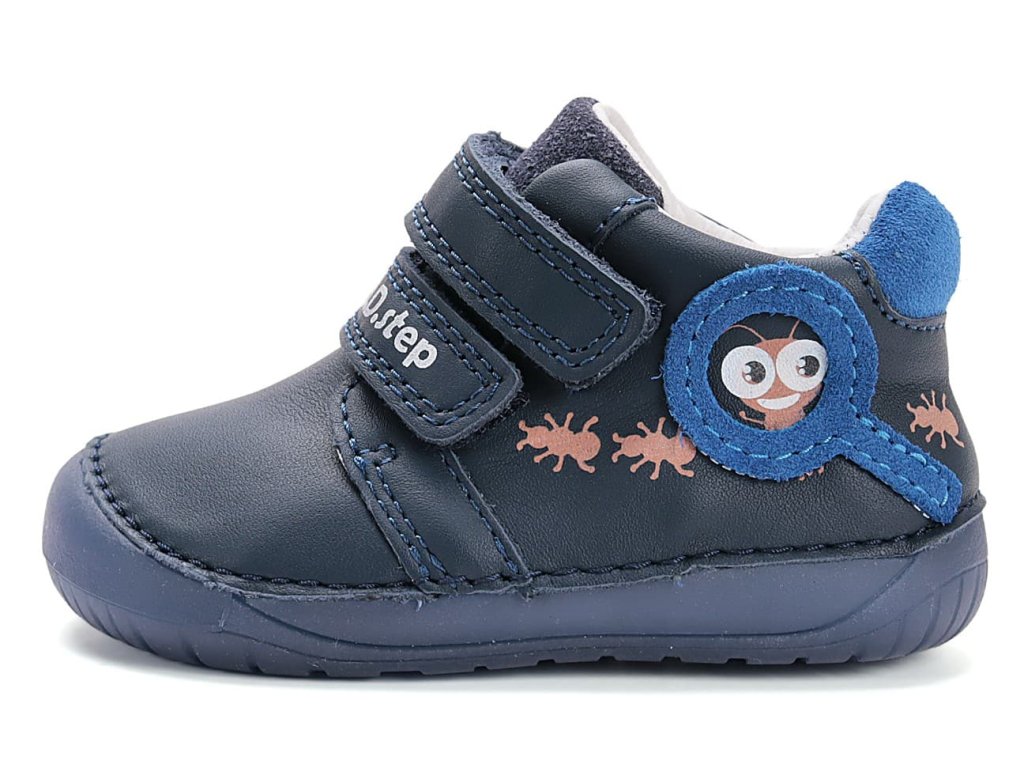 DD step s070-52576A Royal Blue - chlapčenské barefoot topánky vhodné na normálne a širšie nôžky. Z praktickej hladkej kože v modrej farbe s motívom mravcov na boku. Široká predná časť a výborne tvarovaná špička aj pre dominantný palec (teda prípad, keď je palec dlhší ako ostatné prsty).