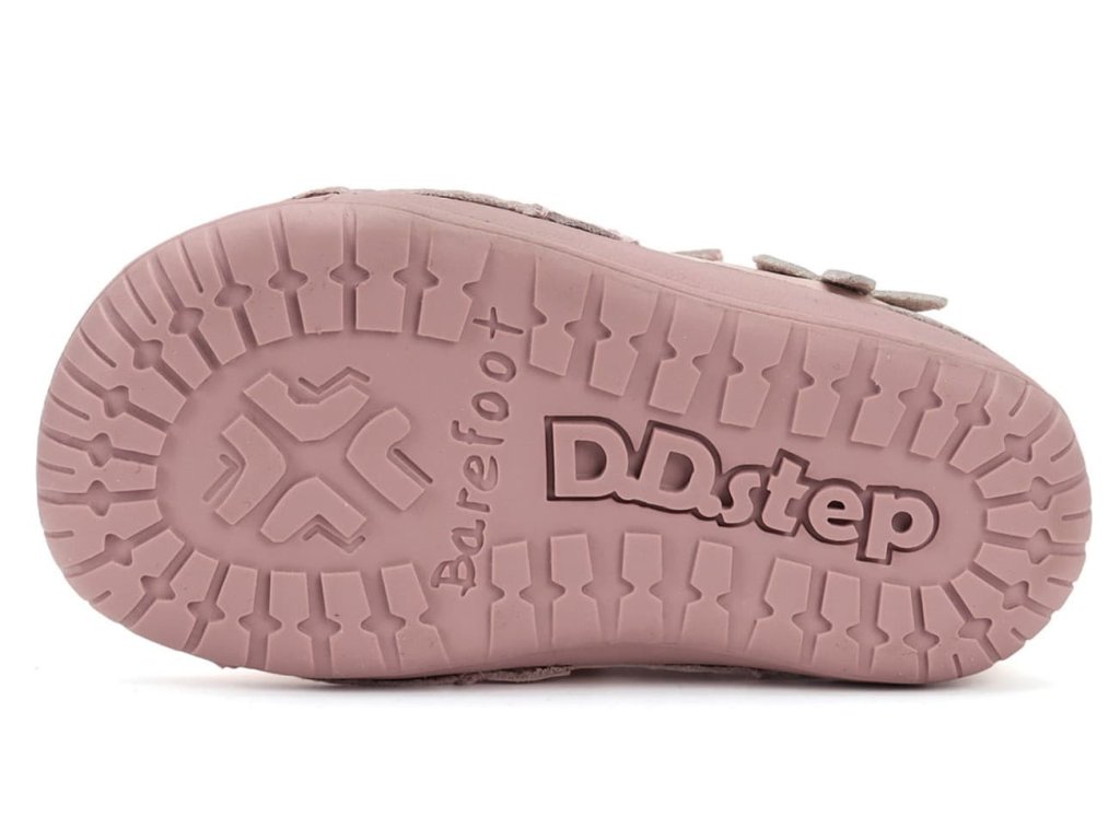 DD step s070-52656 Baby Pink - dievčenské ružové barefoot topánky vhodné na normálne a širšie nôžky. Z praktickej hladkej kože v ružovej farbe s motívom kvietku a motýlika na boku. Široká predná časť a výborne tvarovaná špička aj pre dominantný palec (teda prípad, keď je palec dlhší ako ostatné prsty).