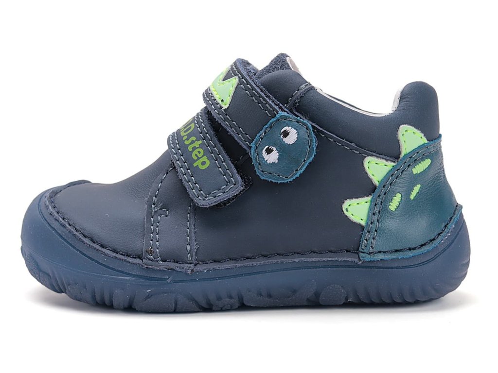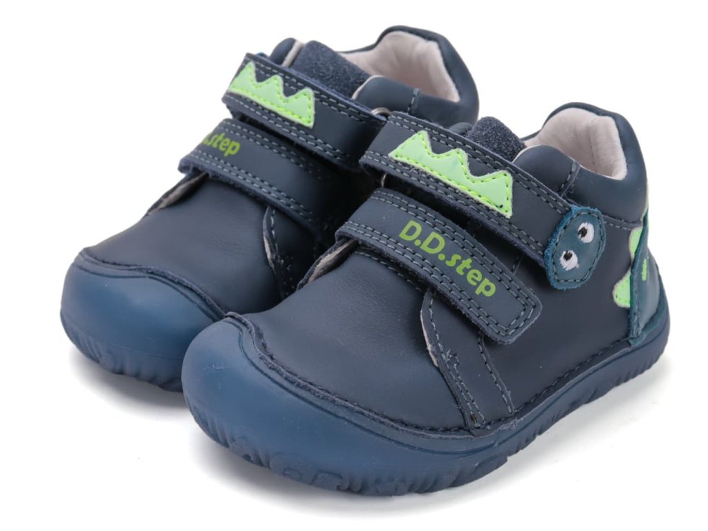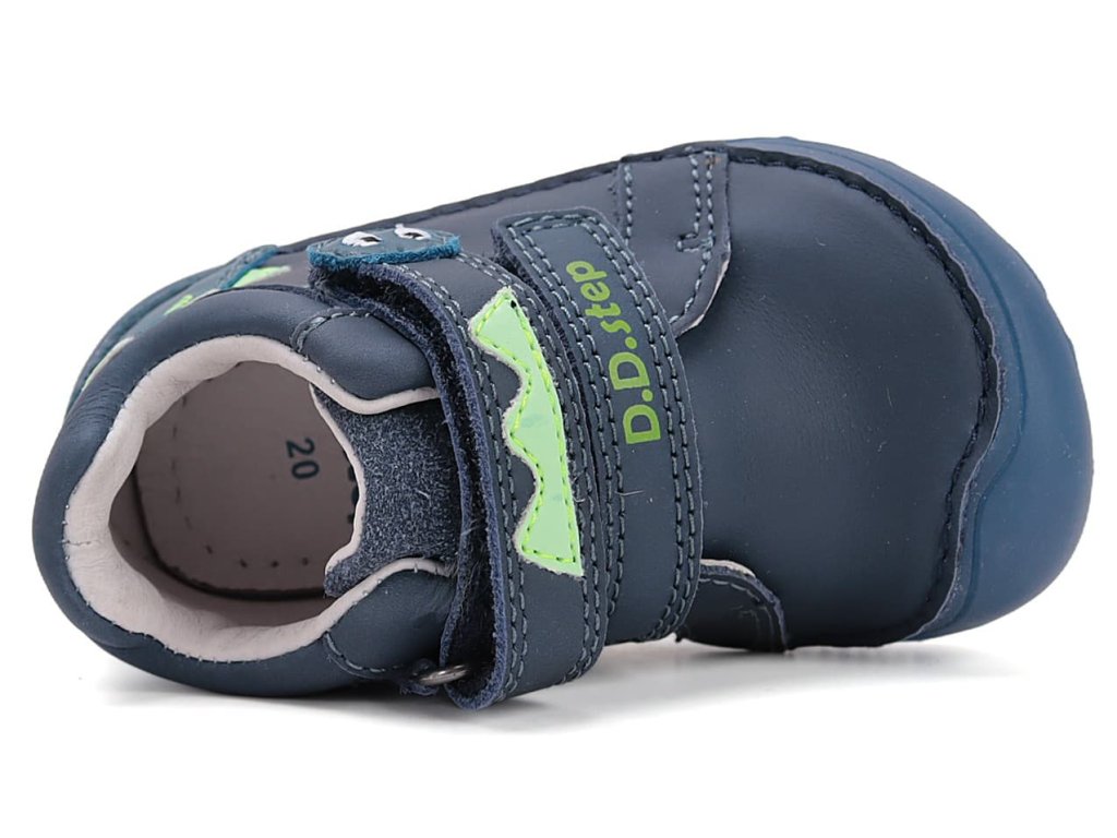 DD step S073-52875 Royal Blue sú barefoot topánky vhodné na široké nôžky . Tmavomodré topánky s modrou podrážkou a svietivo zelenými detailmi. Širšia predná časť a výborne tvarovaná špička aj pre dominantný palec (teda prípad, keď je palec dlhší ako ostatné prsty).