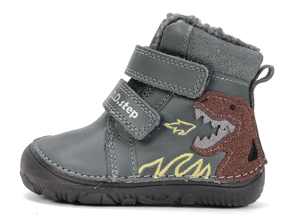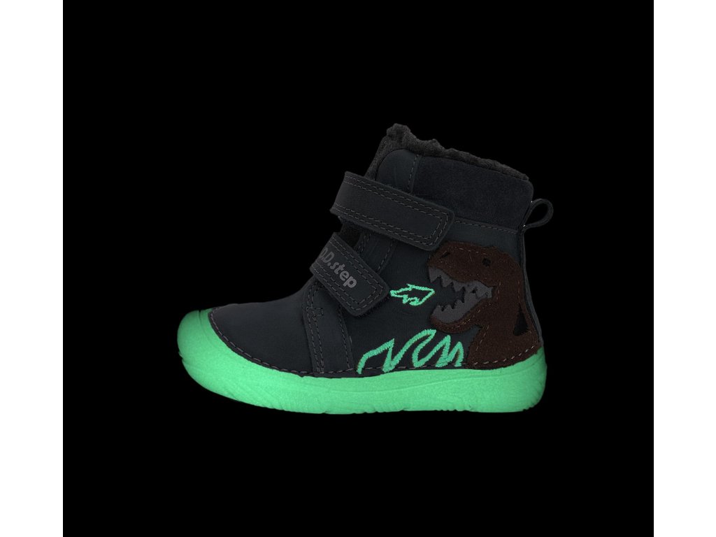 Chlapčenské barefoot topánky DD Step W073-52943 Emerald. Zimné topánky v zelenej farbe s drakom. DD Step 073 - najohybnejšia a najviac barefootová topánka od DDstep. Rad 073 je tvarovo veľmi podobný 063, je ale výrazne širší - viď rozmery nižšie v popise. Topánky sú celokožené, končí kúsok nad členkom. Vnútri celej topánky je teplý kožúšok. Navyše topánky v tme fosforovo svietia!