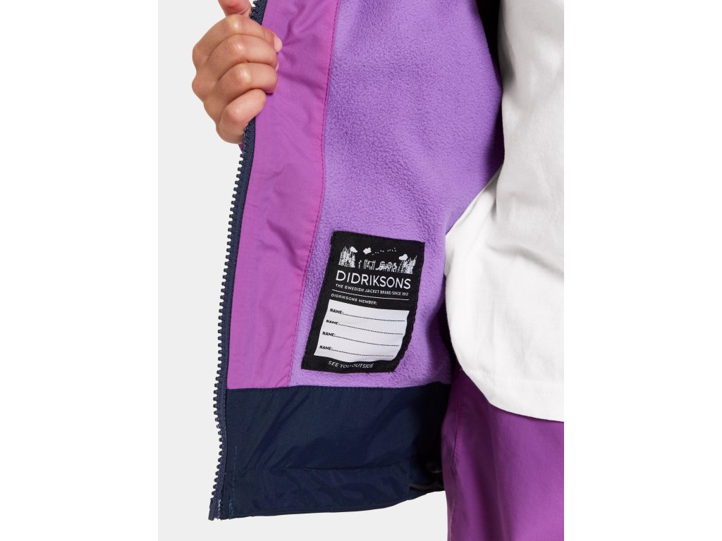 Detská nepremokavá bunda Didriksons Enso v kombinácii fialovej a tmavo modrej farby - univerzálny kúsok vhodný na prechodové obdobie - jar a jeseň . Je vetruodolná a 100% nepremokavá. Jemná fleecová podšívka príjemne zahreje a nehryzie. Ako jedna z mála detských búnd má vrecká, ktoré deti jednoducho milujú - môžu si so sebou vziať všetky svoje poklady. Odopínateľná kapucňa, ktorá je tiež zateplená fleecom.
