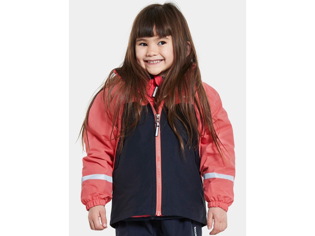 Detská nepremokavá bunda Didriksons Enso v kombinácii ružovej a tmavo modrej farby - univerzálny kúsok vhodný na prechodové obdobie - jar a jeseň. Je vetruodolná a 100% nepremokavá. Jemná fleecová podšívka príjemne zahreje a nehryzie. Ako jedna z mála detských búnd má vrecká, ktoré deti jednoducho milujú - môžu si so sebou vziať všetky svoje poklady. Odopínateľná kapucňa, ktorá je tiež zateplená fleecom.