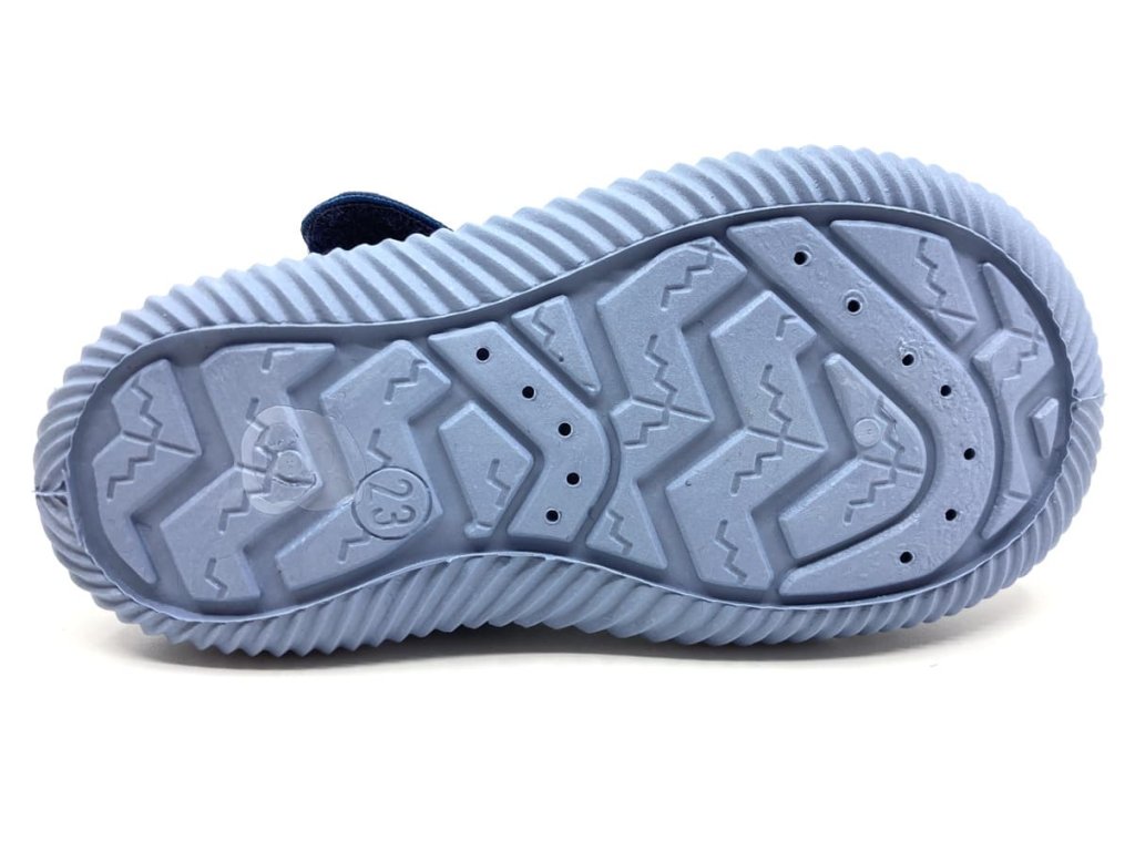 Chlapčenské papuče Peon MI/024 JS v modrej farbe a motívom dinosaura. Modrá, pomerne ohybná a nekĺzajúca podrážka, ktorá nerobí šmuhy a má zo spod podošvy otvory pre väčšiu priedušnosť. Kožená antibakteriálna stielka je vyberateľná. Papuče sú vhodné na širšie nožičky aj vyšší priehlavok.
