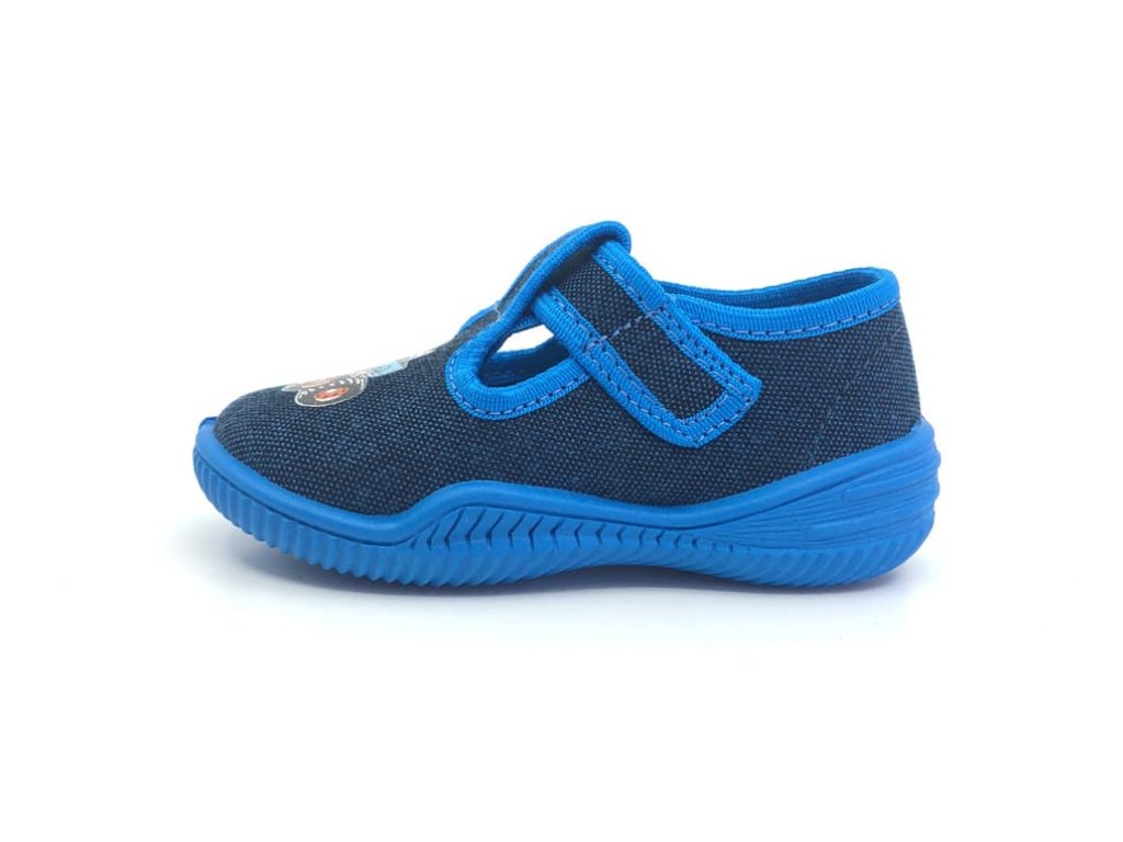 Chlapčenské papuče Peon MI/013 ST v tmavo modrej farbe a motívom Monster Truck. Modrá, pomerne ohybná a nekĺzajúca podrážka, ktorá nerobí šmuhy a má zo spod podošvy otvory pre väčšiu priedušnosť. Kožená antibakteriálna stielka je vyberateľná s miernou podporou klenby. Papuče sú vhodné na širšie nožičky aj vyšší priehlavok.