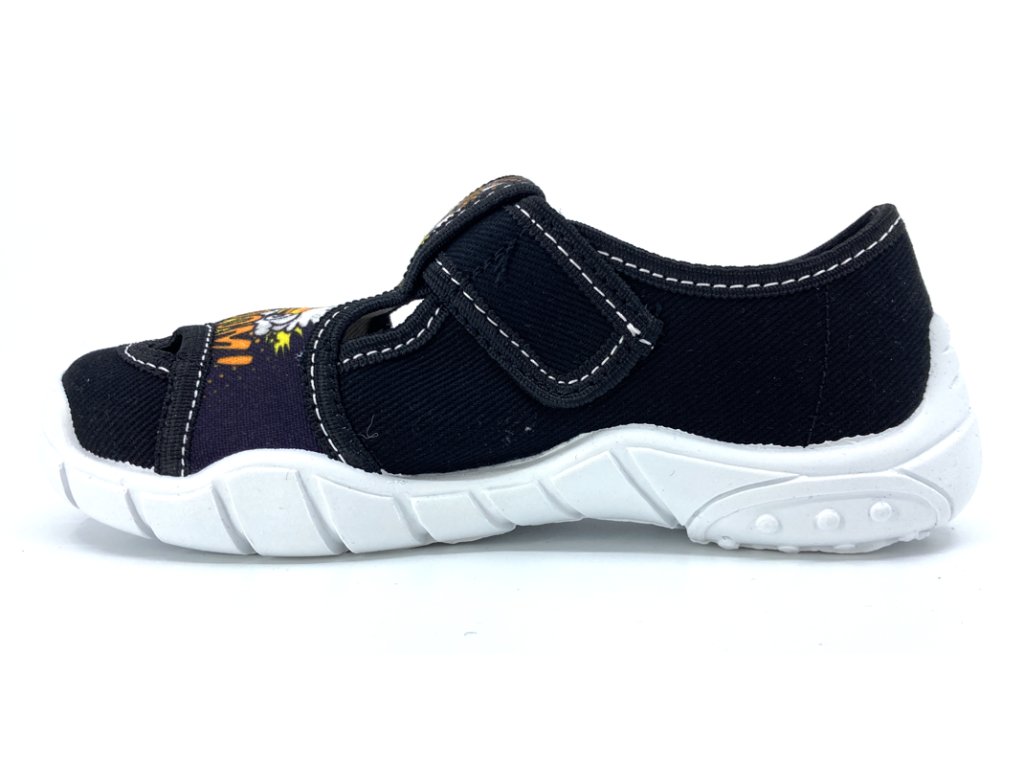 Detské papuče Peon MI 018 AE vyrobené z bavlnenej tkaniny v čiernej farbe, papučky sú s motívom auta . Sú vhodné na normálne široké nôžky a vďaka suchému zipsu sa dajú krásne prispôsobiť v oblasti priehlavku aj členku. Podrážka je veľmi dobre ohybná, nekĺzavá, mäkká av prednej časti mierne zvýšená, chráni tak proti okopu. Drobné otvory v podošve zaistia lepšiu priedušnosť. Vyberateľná kožená stielka s otvormi proti poteniu a miernou podporou pozdĺžnej klenby pre maximálny komfort pri nosení.