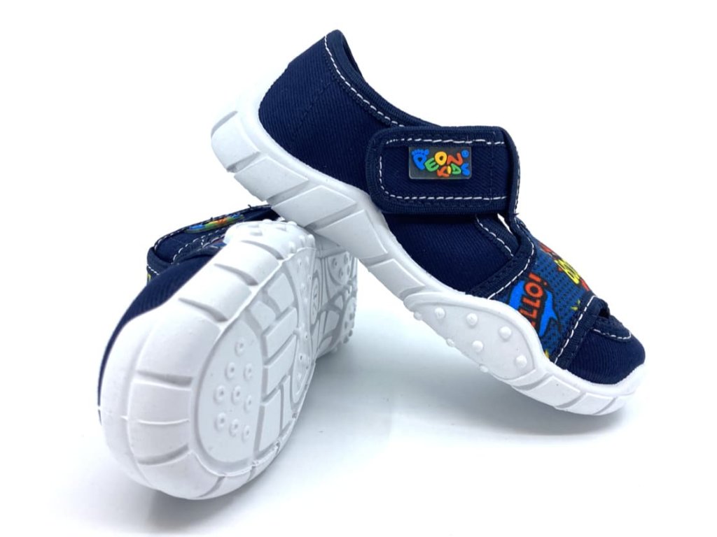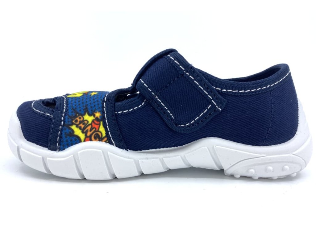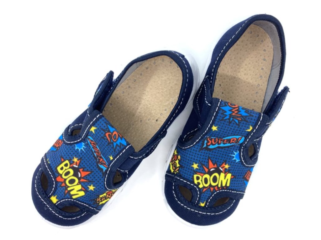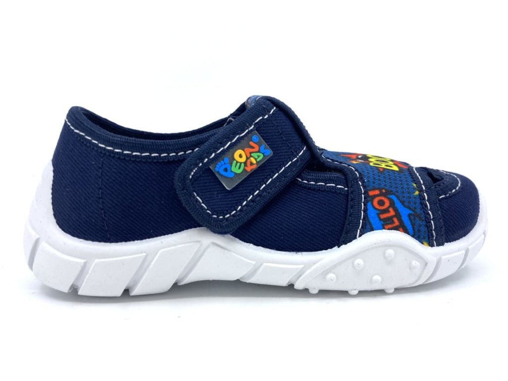 Detské papuče Peon MI 018 AF vyrobené z bavlnenej tkaniny v modrej farbe a komiksovým motívom. Sú vhodné na normálne široké nôžky a vďaka suchému zipsu sa dajú krásne prispôsobiť v oblasti priehlavku aj členku. Podrážka je veľmi dobre ohybná, nekĺzavá, mäkká av prednej časti mierne zvýšená, chráni tak proti okopu. Drobné otvory v podošve zaistia lepšiu priedušnosť. Vyberateľná kožená stielka s otvormi proti poteniu a miernou podporou pozdĺžnej klenby pre maximálny komfort pri nosení.