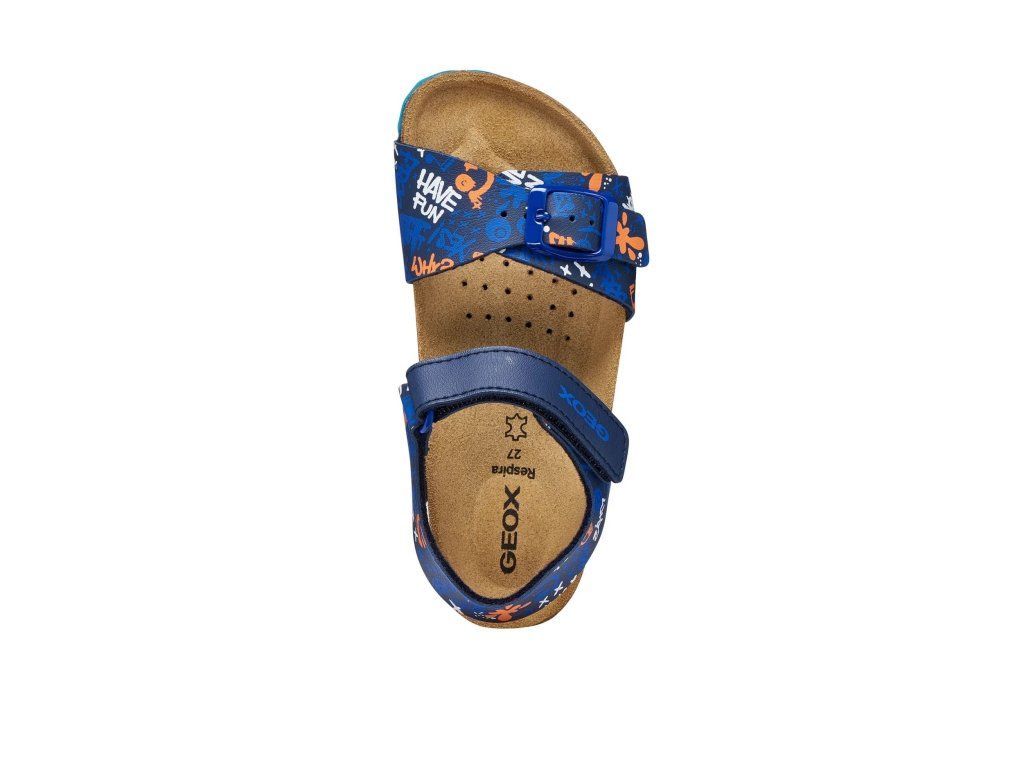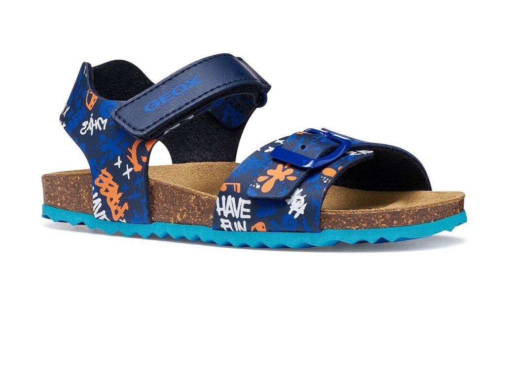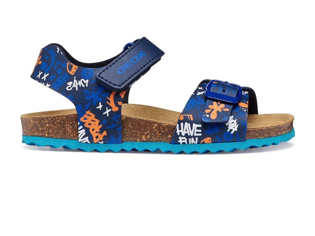 Ľahké a odolné detské sandále Geox Ghitta BB J028 Navy / Blue v chlapčenskej farebnej kombinácii Navy / Blue - modrá v kombinácii s nápismi. Sú perfektnou voľbou pre akékoľvek letné dobrodružstvo, od hier v meste po výlety do prírody, alebo aj ako prezuvky.