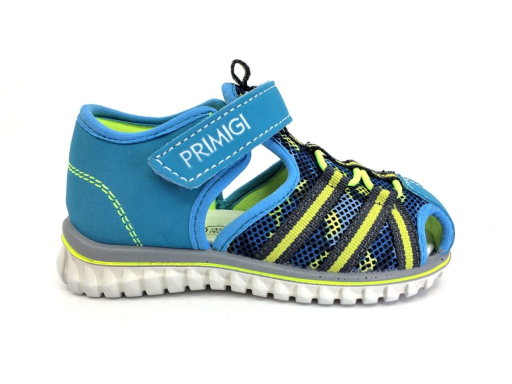 Detské športové sandálky Primigi 1864122 v tyrkysovo modrej v kombinácii s neónovo žltou. Vďaka krytým prstíkom a pevnému opätku sú vhodné aj na prvé krôčiky.