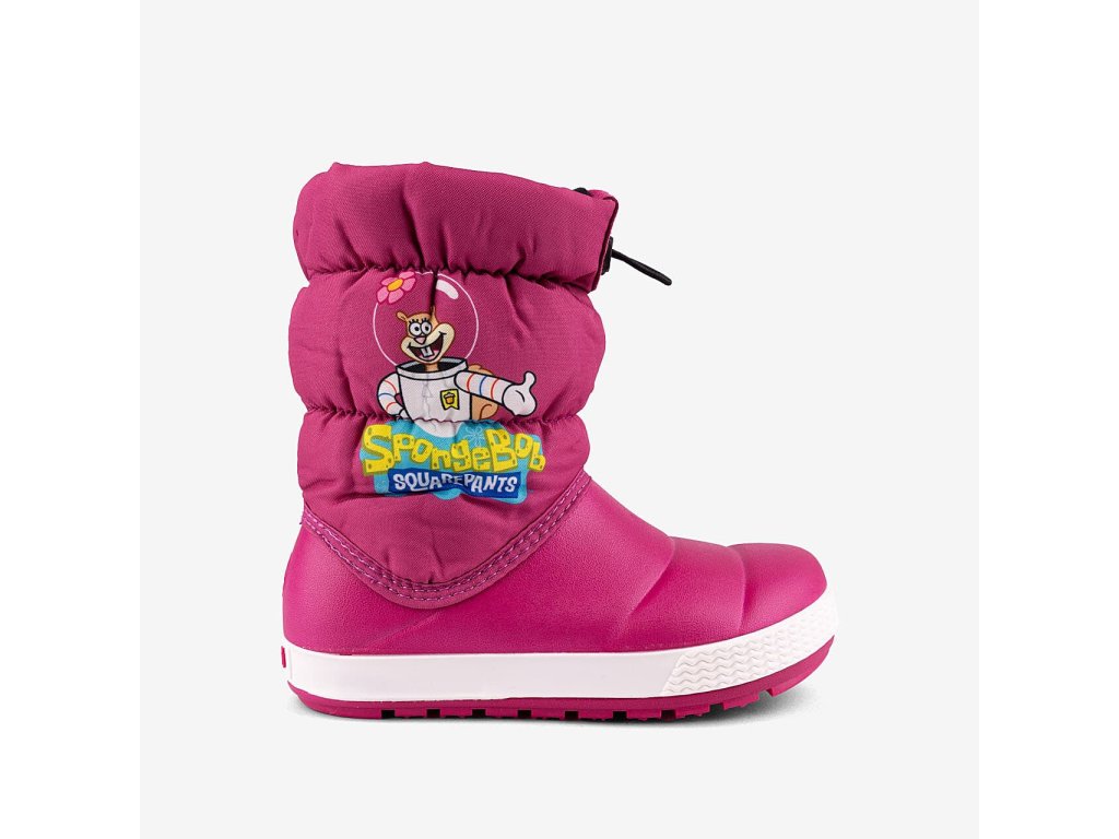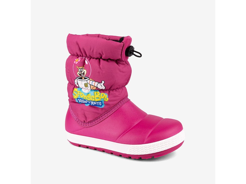 Detské snehule Coqui Mika Magenta/White SB Sandy 5055 - teplé zimné topánky zateplené teplým fleecom, vrchná časť z odolnej textílie, spodná polovica zo syntetickej gumy. Sťahovanie gumičkou v hornej časti zabráni padaniu snehu a pomáha dobrému padnutiu topánky na nohu. V obľúbenom dievčenskom motíve SpongeBob