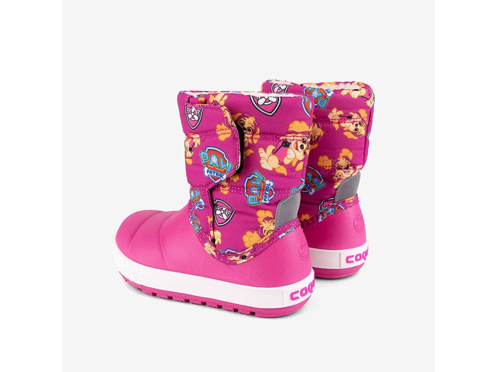 Detské snehule Coqui Miki Fuchsia/White PP Skye 5045 v novej variante s lepším tvarom, ktorý viac zodpovedá skutočnému tvaru nohy. Teplé detské snehule so zapínaním na suchý zips, ktoré uľahčuje obúvanie a ide pomocou neho čiastočne regulovať šírka hornej časti. Zateplené jemným nehryzovým kožúškom, vrchná časť z odolnej textílie, spodná polovica zo syntetickej gumy. Dievčenská ružová farba s obľúbenými motívom Skye z Tlapkovej patroly.