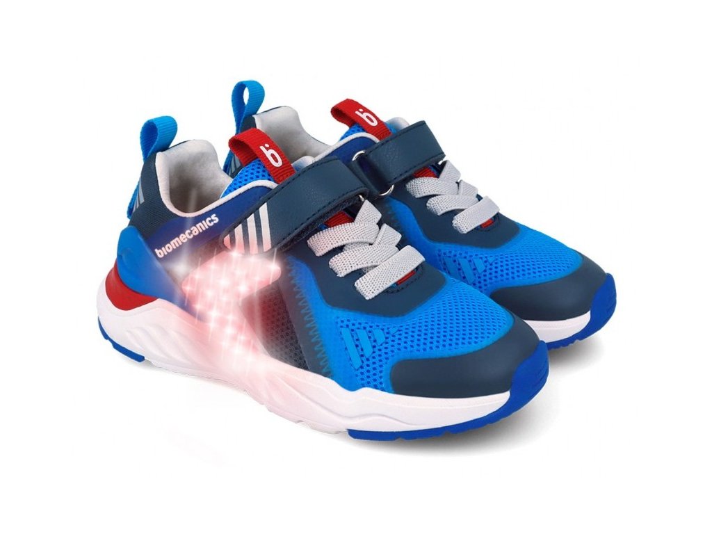 Detské tenisky Biomecanics 262274-A008 v kombinácii čiernej a modrej farby. Topánky pri došliapnutí svietia! V ynikajú naozaj príkladným spracovaním a patentovaným opätkom. Špeciálny Biomecanics opätok je za achilovkou znížený a neobmedzuje tak prirodzený pohyb nohy, pričom stále plní svoju funkciu a zabraňuje tak vtáčaniu päty - ľudovo "šmajdaniu". Topánky vhodné na všetky vonkajšie aktivity, na detské behanie po ihrisku aj nosenie do školy. V prednej časti gumová ochrana proti okopu, ktorá zároveň pomáha aj proti premočeniu topánky. Podrážka je ľahká a perfektne ohybná v smere chôdze.