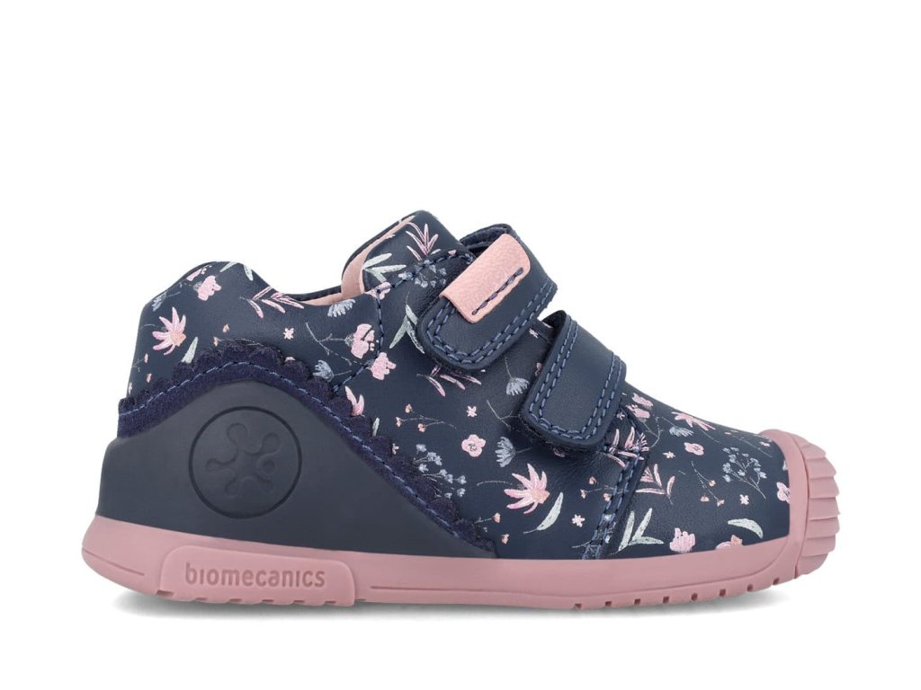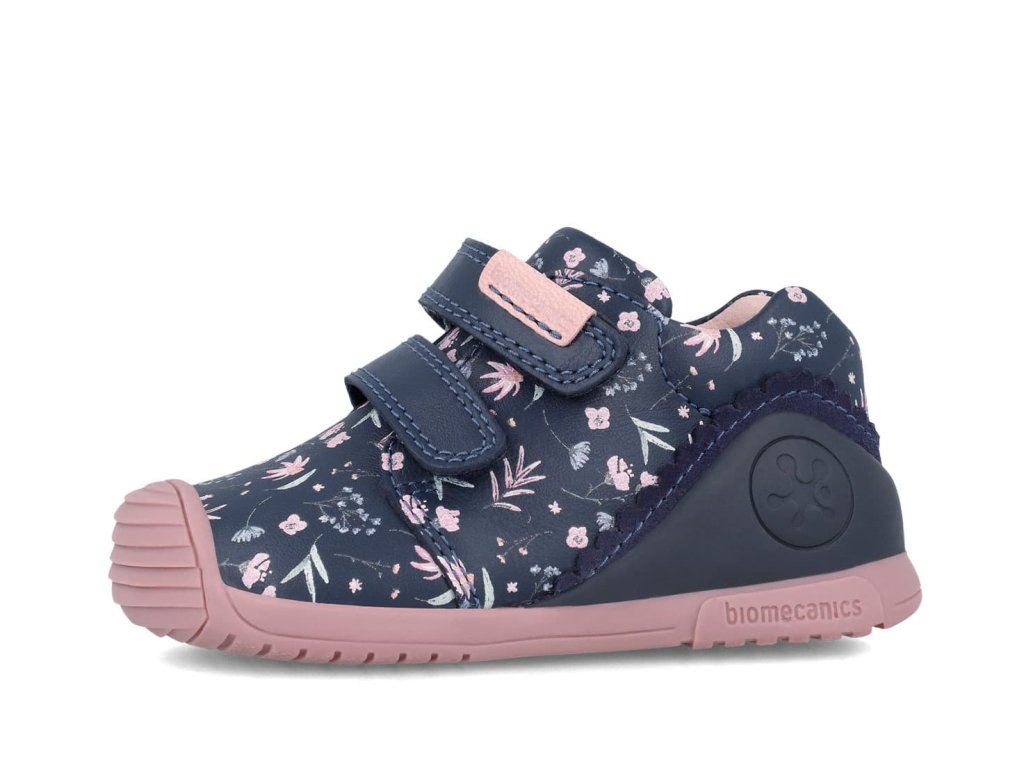 Detské topánky Biomecanics 241102-A z hladkej kože v tmavo modrej farbe s dievčenským motívom kvetiniek. Majú nový upravený tvar špičky, ktorá zodpovedá anatomickému tvaru nohy, a sú tak skvelým kompromisom medzi barefoot a klasickými topánkami. V ynikajú naozaj príkladným spracovaním a patentovaným opätkom. Špeciálny Biomecanics opätok je za achilovkou znížený a neobmedzuje tak prirodzený pohyb nohy, pričom stále plní svoju funkciu a zabraňuje tak vtáčaniu päty - šmajdaniu.