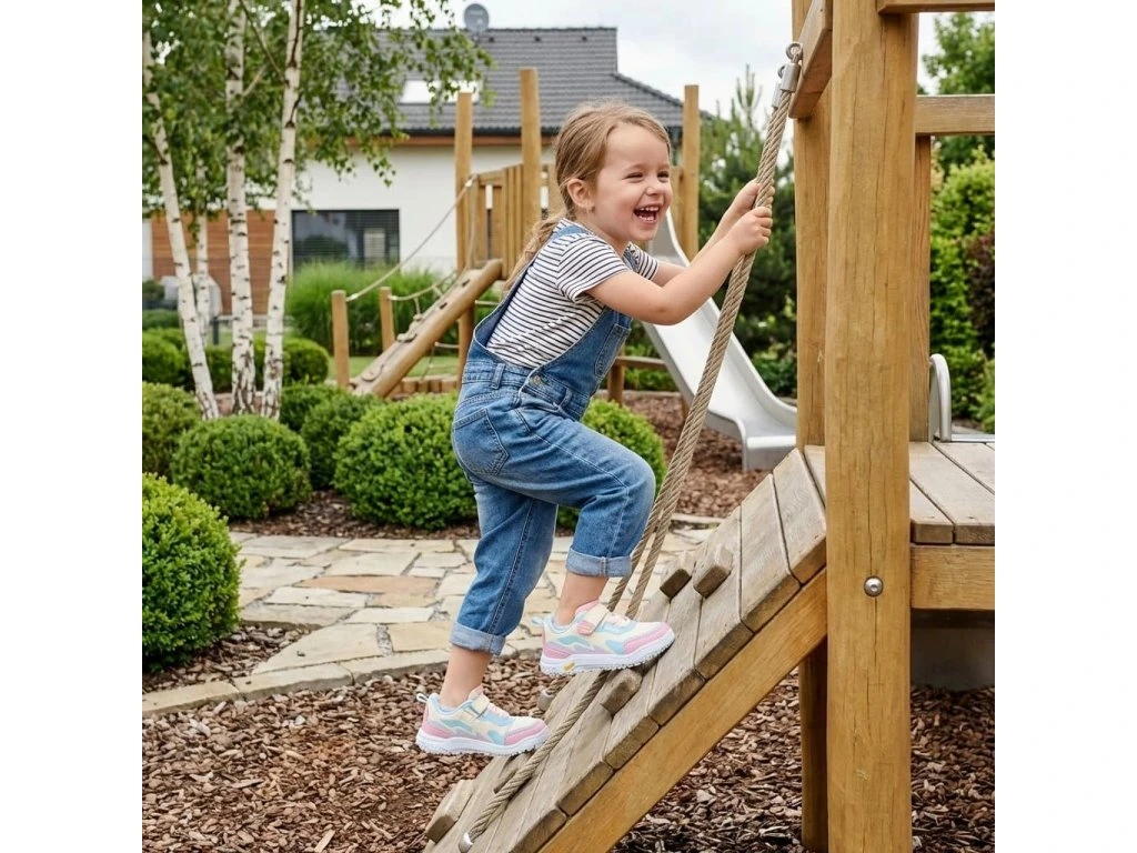 - Zapínanie: suchý zips (velcro pásik) pre rýchle a bezpečné utiahnutie ku členku, v spodnej časti gumička imitujúca šnúrky, gumička ide tiež stiahnuť, čím sa topánka prispôsobí na nižší priehlavok