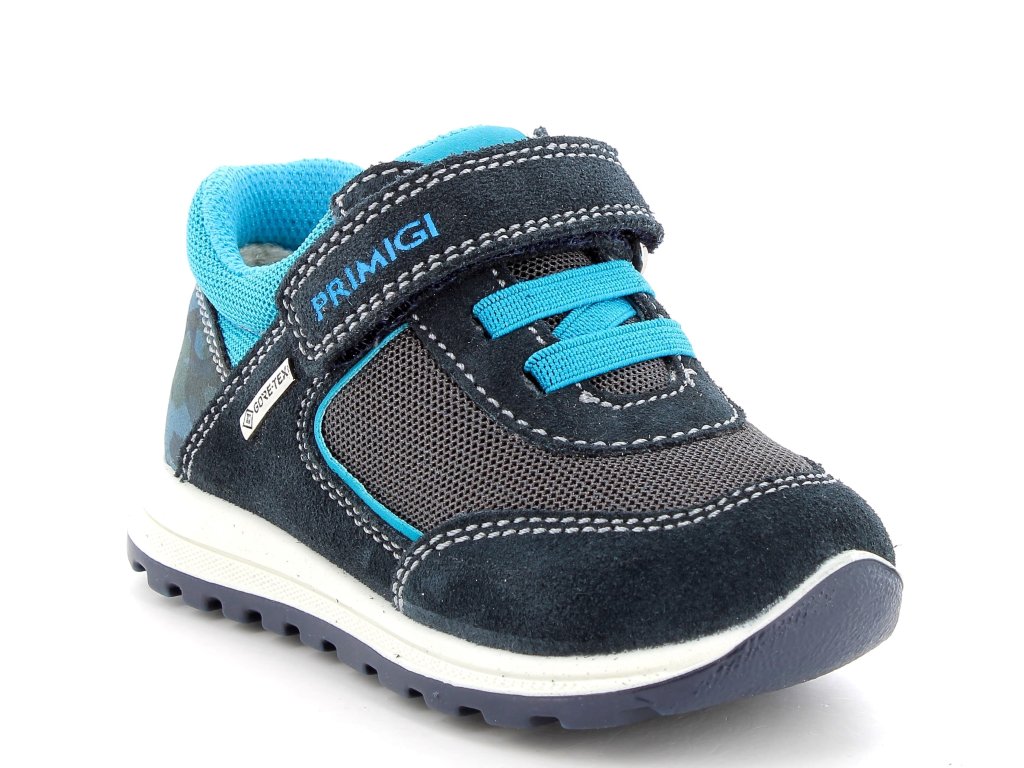 Moderné chlapčenské celoročné topánky Primigi 3855322 v modrej farbe s tyrkysovými detailmi. Topánka je celá podšitá Goretex membránou, a tak ani priedušná textilná časť na špičke nikdy nepremokne. Dobre ohybná, mäkká a ľahká podrážka v tmavo modrej farbe zaistí pohodlie. Vďaka membráne Gore-tex sú topánky vhodné aj do daždivého počasia.