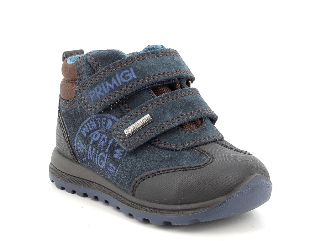 Detské celoročné topánky Primigi 4854211 Gore-Tex, vhodné najmä na jeseň. Funkčná kombinácia brúsenej kože v tmavo modrej farbe s hnedými detailmi a textilným lemom okolo členku a odolnou syntetickou ochranou proti okopu. Topánky sú funkčné a zároveň odolné vode vďaka membráne Gore-Tex.